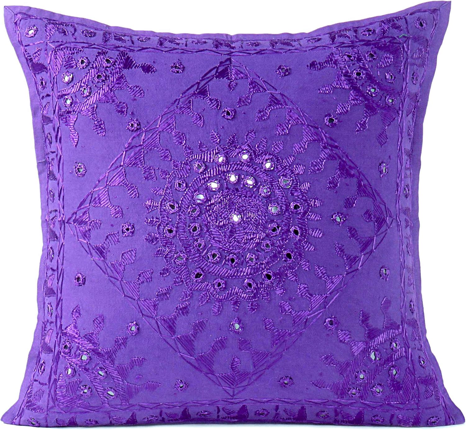 Eyes of India Embroidered Decorative Boho Throw Pillow Cover with Mirrors, Handmade Bohemian Accent Cushion Case for Sofa Couch Bedroom Living Room (Purple, 16" x 16")