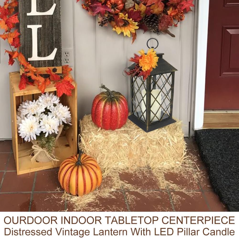 - LIFE-SIZE VINTAGE LANTERN WITH LED PILLAR CANDLE - The life-size vintage candle lantern, with toughened glass panes, cross grids and DISTRESSED GOLD Metal Looking Coating, creates an aura of old world charm - Made of lightweight PP thermoplastic that is heat and moisture resistant - A big LED bisque pillar candle with the Warm White flicker - A graceful marriage of beauty & practicality adds a gorgeous touch anywhere - Eye-catching prop for tables, bars, patios; fabulous indoor & outdoor decor.