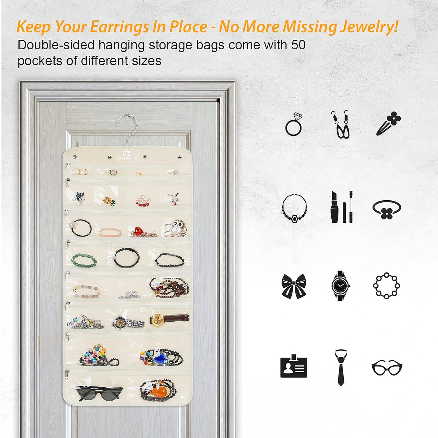 - 2 VERSIONS TO CHOOSE FROM: In addition to the 50 pockets version, we offer an alternative hanging jewelry organizer with 25 transparent pockets and 23 Hooks! Choose whichever fits you and put all your rings, earrings, lockets, necklaces, watches, brooches, pins and other jewelry in order!