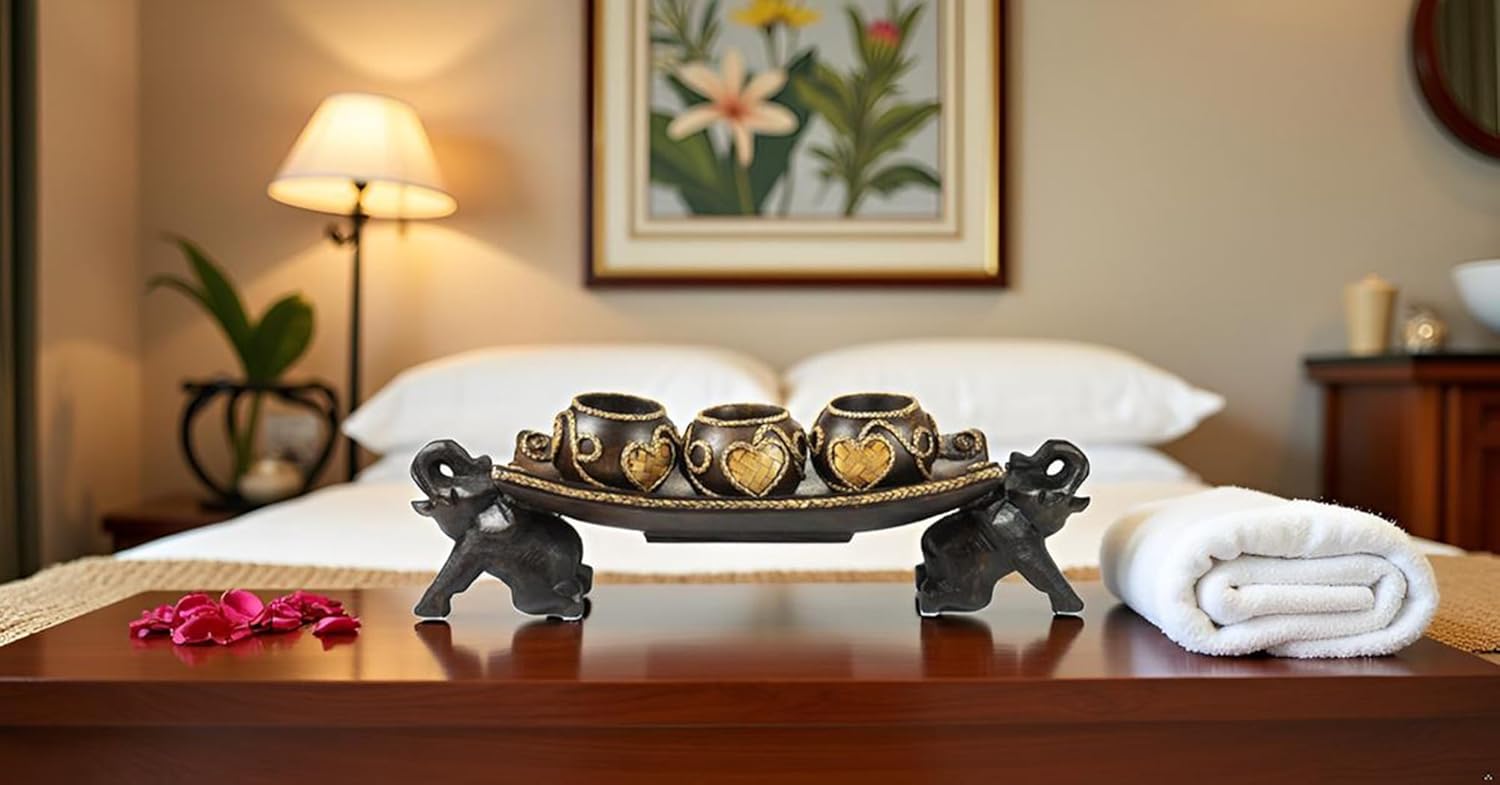 Thai Elephant Tray Carved Rain Tree Wooden Candle Holder