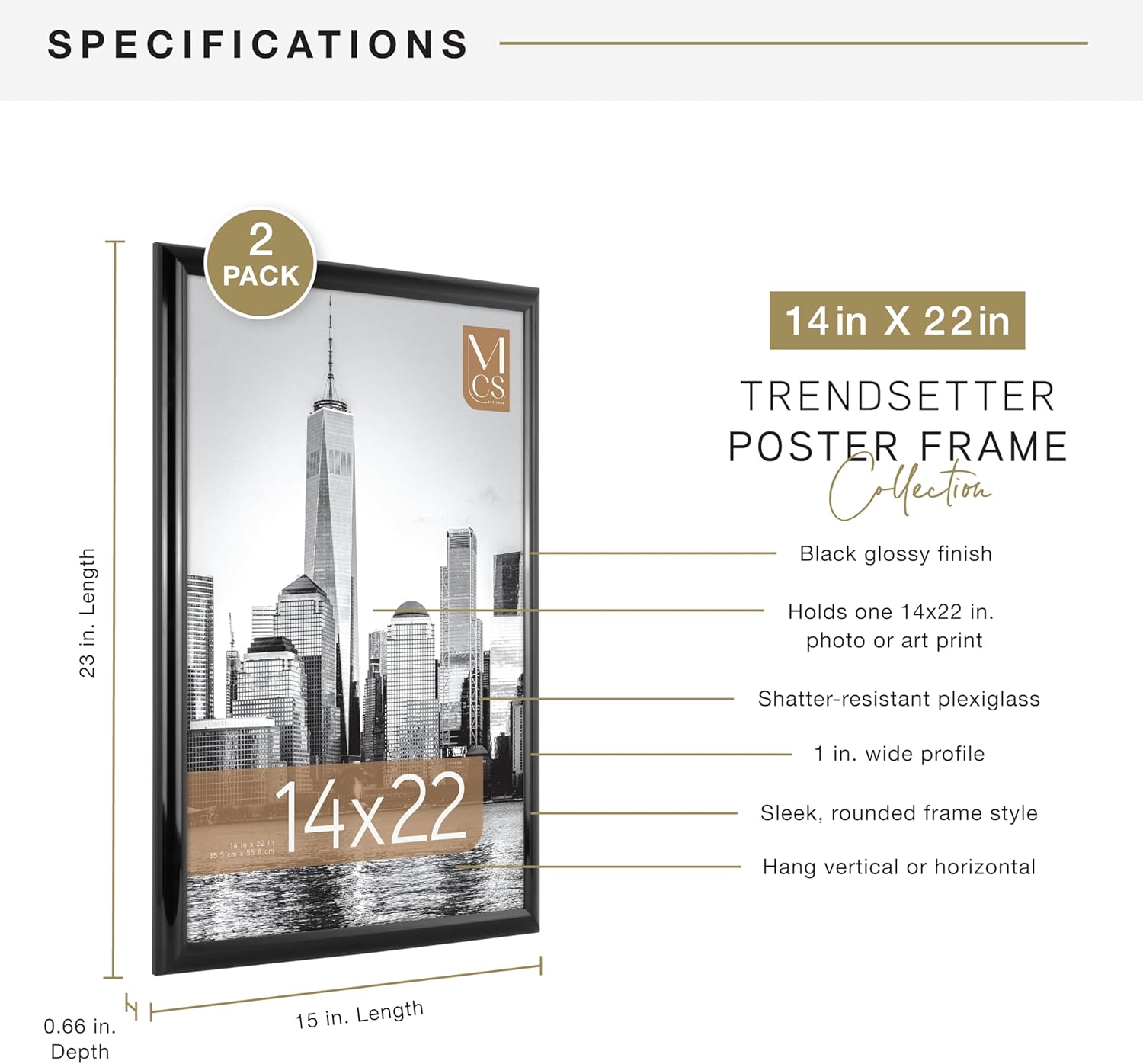 MCS Trendsetter 14x22 Poster Frame Black High-Gloss, Vertical & Horizontal Wall Hanging Large Picture Frame for Photos, Posters & Art Prints (2-Pack)