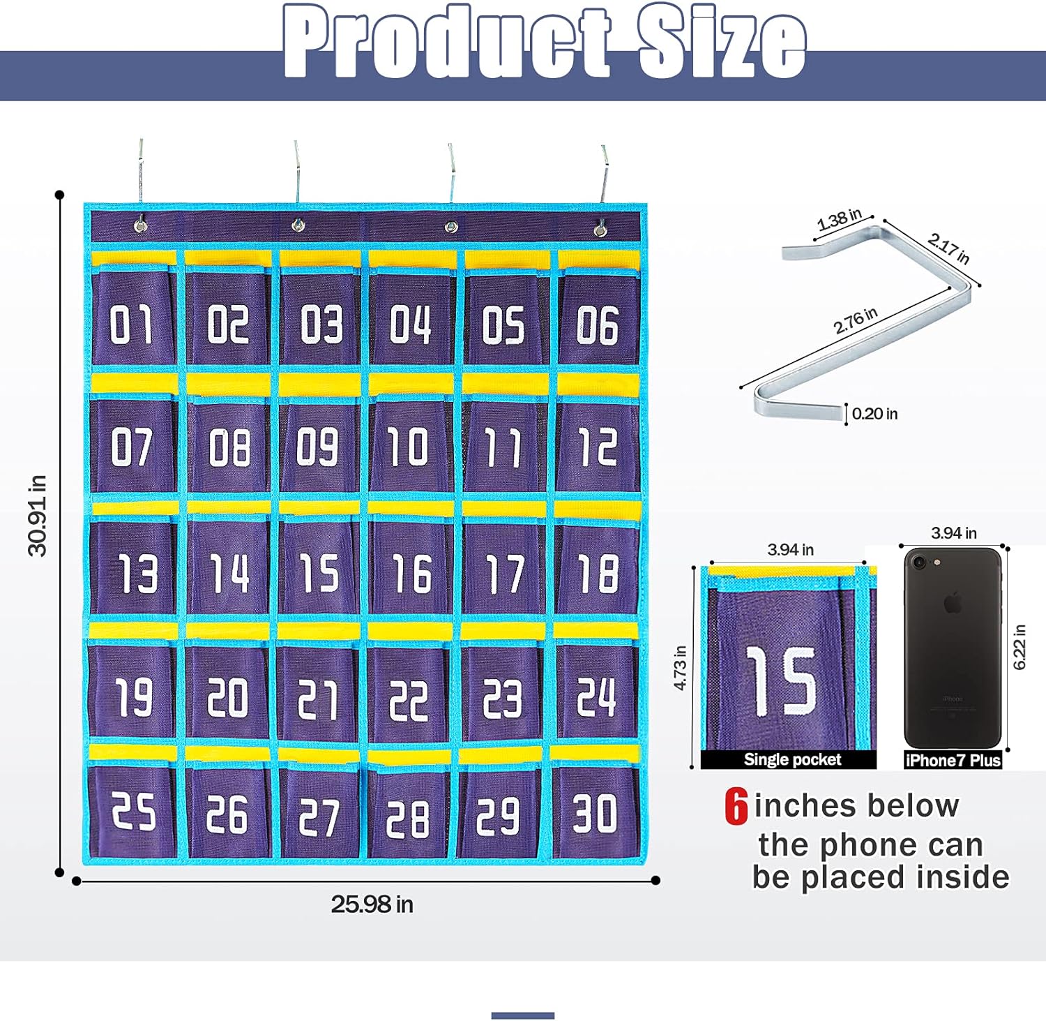 - ă4 Metal Hooks for Classroom Pocket Chartă Calculator Phone pouch fit the top of whiteboard or over the door as thick as 1.3"-2", hanging organizer with pockets supports the weight of 30 phones (about 20 lb), easy to install and close the door.
