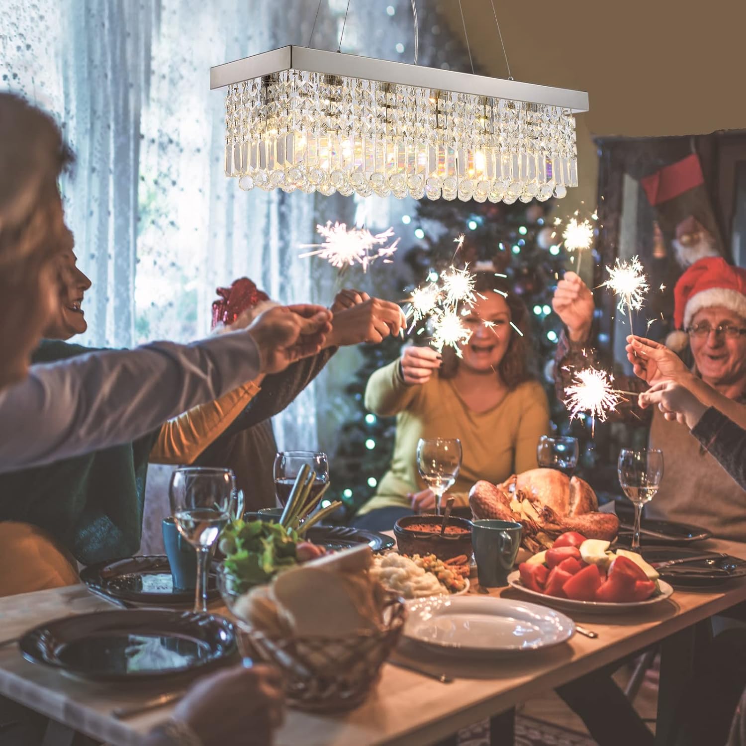 Siljoy 6-Light Modern Crystal Chandelier for Dining Room, Rectangular K9 Crystal Raindrop Chandelier, Rectangle Pendant Ceiling Light Fixture for Living Room Kitchen Island L31.5'' x W10'' x H10''