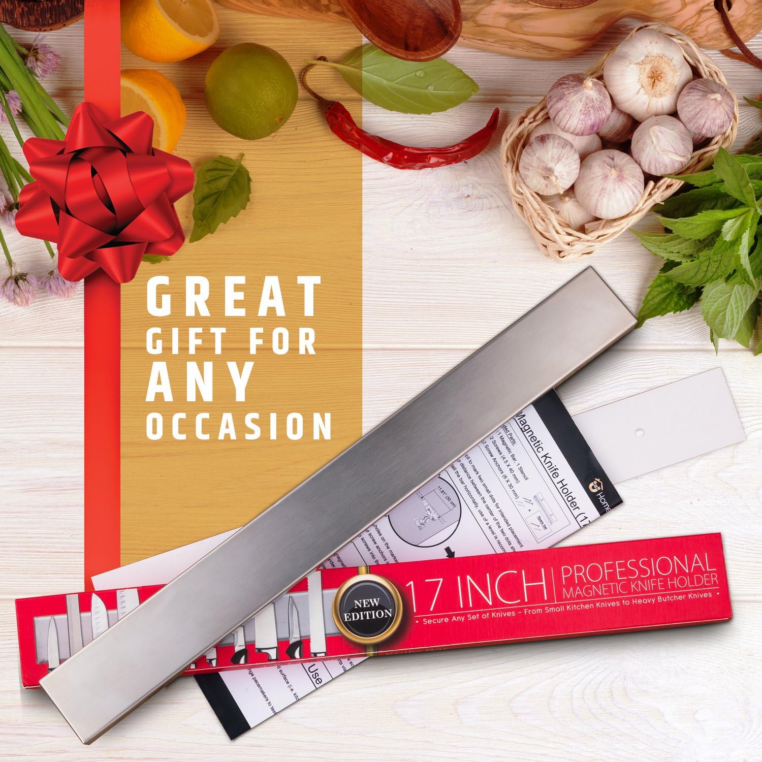- BEFORE YOU BUY: This knife holder is 17" long, weighs 2.88 lbs, and must be wall-mounted with screws only (no adhesive or fridge-mount). Please double-check your wall type and available space to ensure it’s the right fit before ordering.