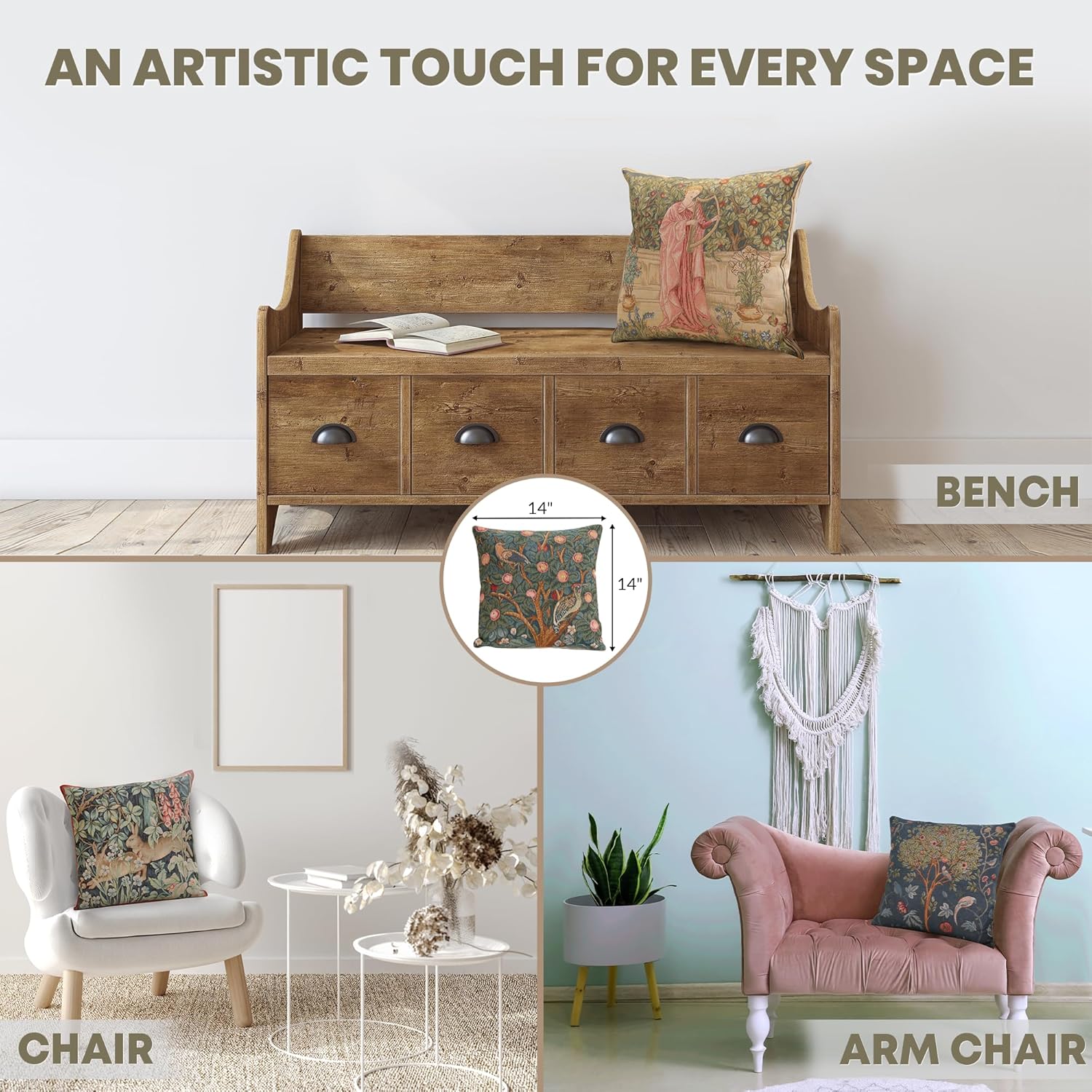 - Timeless Durability: Elevate your decor with our skin-friendly William Morris pillow covers 14βX14β, where quality and style come together. A sturdy hidden zipper ensures easy pillow insertion/removal, while the overlock stitches prevent seam ripping. Unlike thin printed cushion covers prone to tearing, our decorative pillows for couch with a super-soft backside are crafted with thick premium threads for long-lasting quality. THE PACKAGE INCLUDES A SINGLE TAPESTRY PILLOW COVER WITHOUT AN INSERT