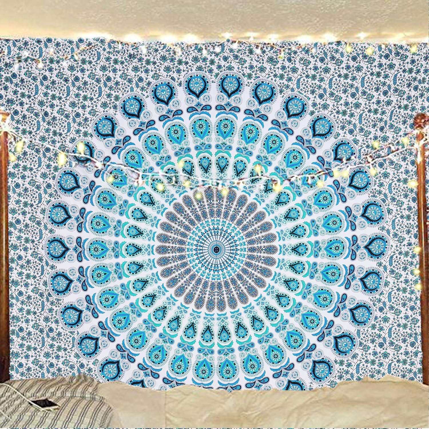 Bless International Handmade Indian hippie Bohemian Psychedelic Peacock Mandala Wall hanging College Dorm Beach Throws Table Cloth Bedding Tapestry (Peacock Sky Blue, King(88x104Inches)(225x265Cms))