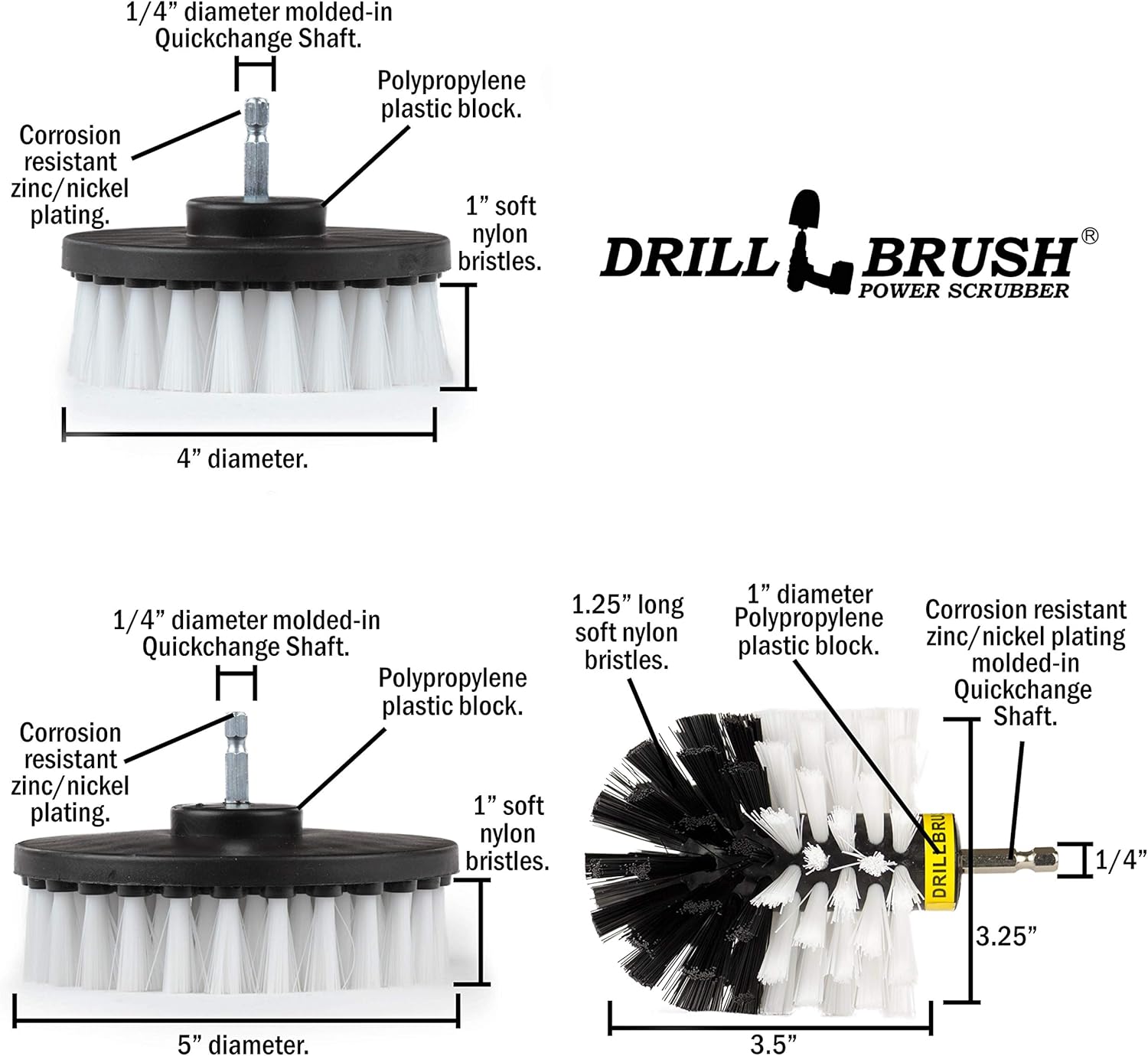 - Included: The Original Drillbrush Power Scrubber in soft white, a MINI Original, a 5-inch diameter, a 4-inch diameter, 2-inch diameter short bristle, and a 2-inch long bristle brush (all in soft white). All brushes in this cleaning drill brush set feature rugged steel shafts with quarter inch quick change ends, allowing use with half-inch drills, three-eighths drills, AND quick-change drivers. Includes multiple sizes of power scrubbing brush so you always have the right tool for the job.