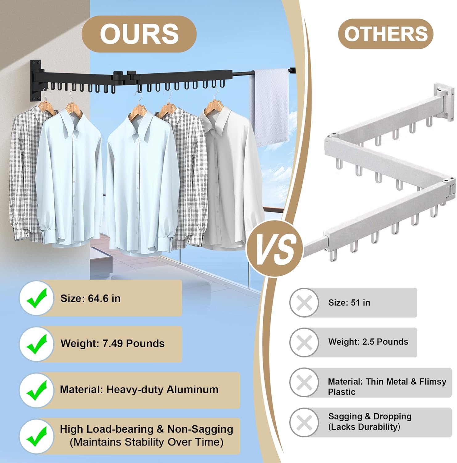 - 【Ultra Sturdy & No Sagging Design】This wall-mounted drying rack clothing is crafted from Heavy-duty Gauge Metal Stainless Steel, it CAN HOLD UP TO 330LBS without sagging, handling large laundry loads effortlessly. Weighing 7.49 lbs, it's built to last over 5 years use, making it the perfect laundry drying solution for secure and supported laundry room organization.