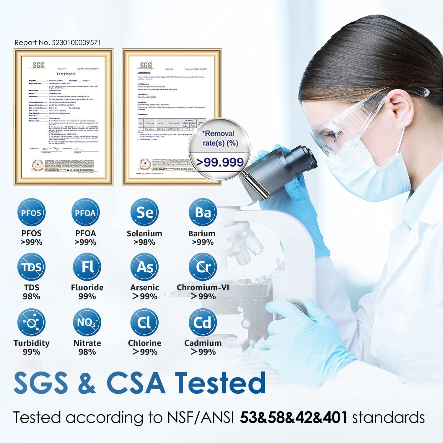 - ๐-๐ฌ๐ญ๐๐ ๐ ๐๐ข๐ฅ๐ญ๐ซ๐๐ญ๐ข๐จ๐ง: Tested by official third-party laboratory (SGS), the reverse osmosis system can effectively reduce TDS, chromium, PFAS, radium, fluoride, arsenic salt, iron, calcium, particles, chloride, chlorine and radioactive substances in your tap water. And our RO water filter system can reduce chemicals such as vinyl chloride, ethylhexyl acrylate, isobutylene, ethylene glycol, according to the reverse osmosis membrane technical manual.