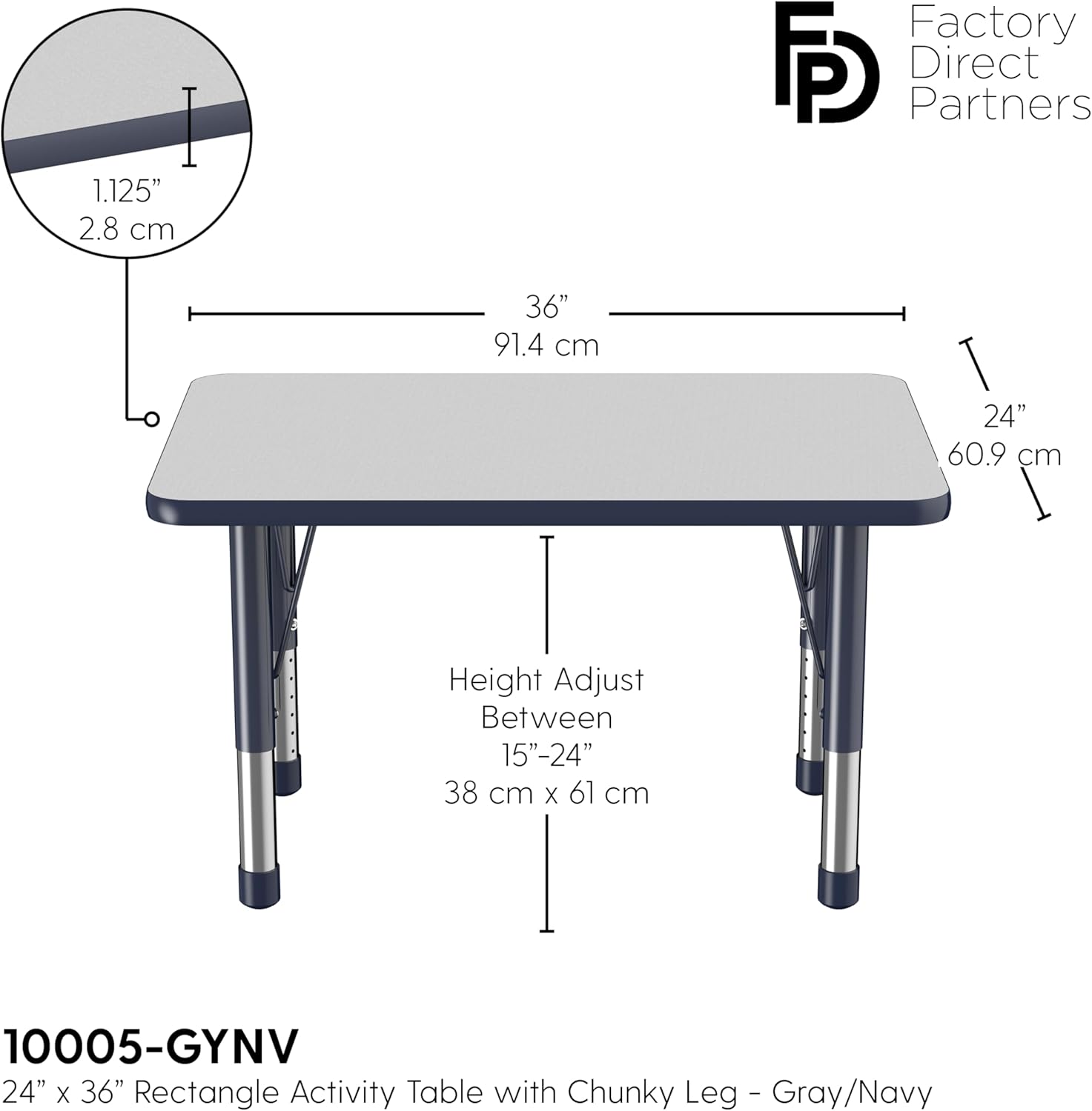 FDP Rectangle Activity School and Classroom Kids Table (24 x 36 inch), Chunky Toddler Leg, Adjustable Height 15-24 inches - Gray Top and Navy Edge
