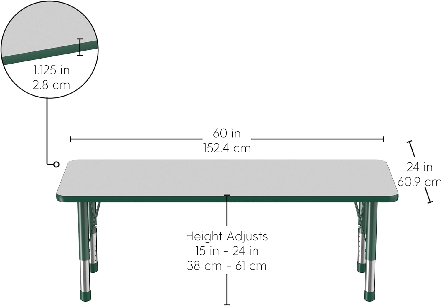 Factory Direct Partners FDP Rectangle Activity School and Classroom Kids Table (24 x 60 inch), Chunky Toddler Legs, Adjustable Height 15-24 inches - Gray Top and Green Edge