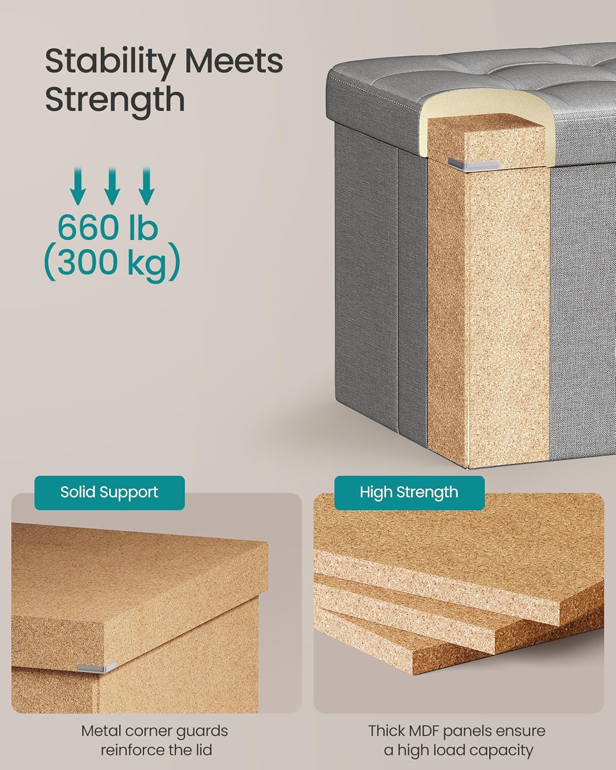 - ăSTURDY AND DURABLEăBuilt with premium MDF panels and reinforced with metal corner guards on the lid, this ottoman is strong enough to support up to 660 lb (300 kg), making it a reliable seating or storage solution that will stand the test of time