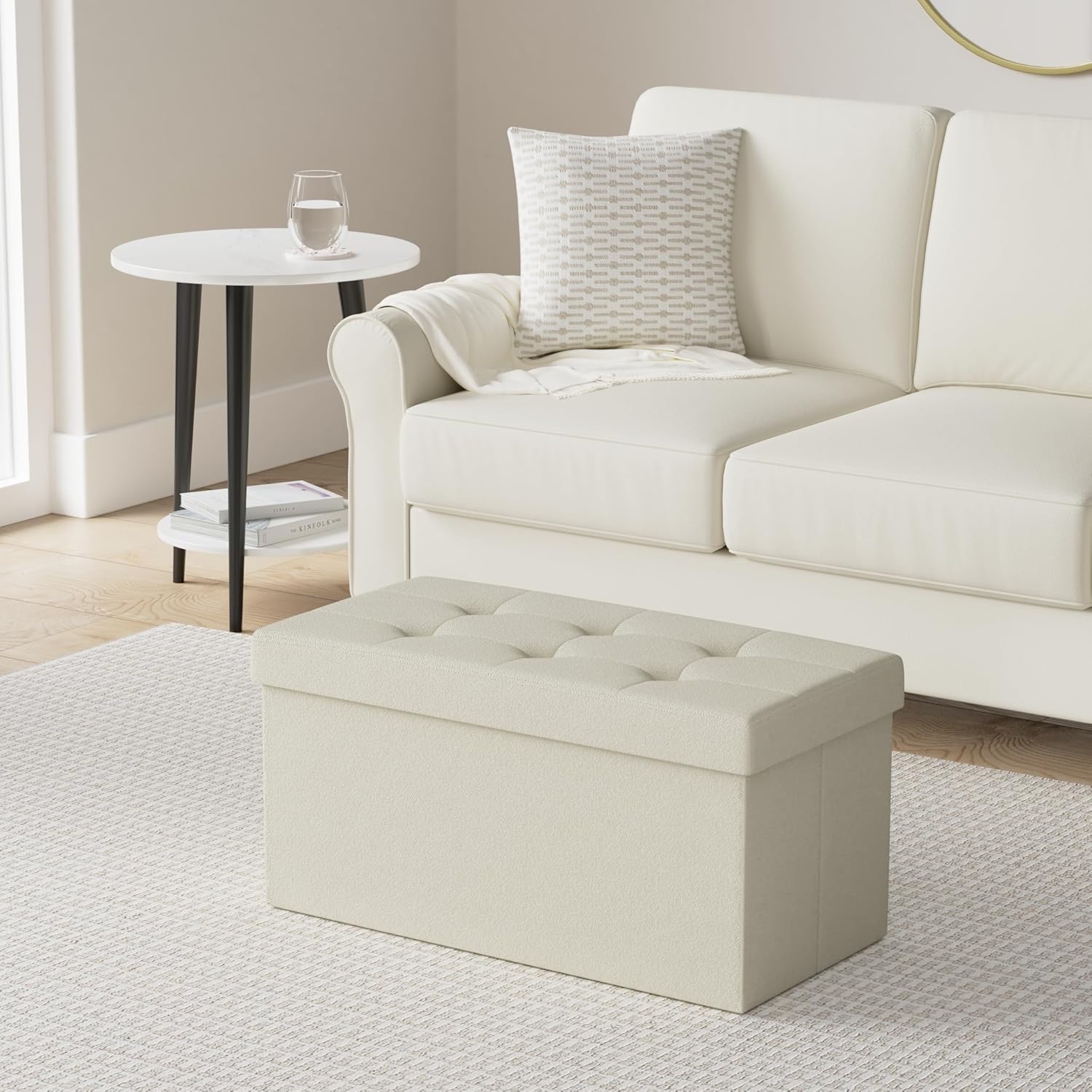 SONGMICS MAZIE Collection - 30 Inches Folding Storage Ottoman Bench, Ottoman Foot Rest, End of Bed Bench, Storage Chest, Load 660 lb, for Living Room, Bedroom, Entryway, Cream White ULSF47BE