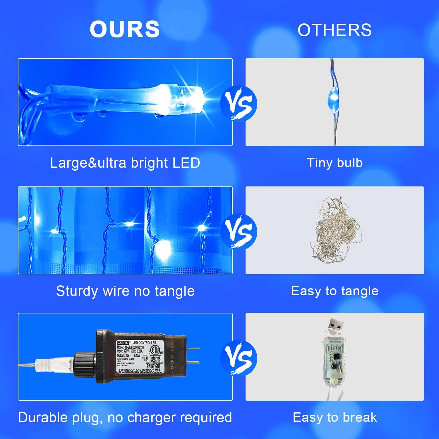 - Customer Team: If there are any problems with our indoor-outdoor blue Christmas curtain lights, please get in touch with us and we will return or refund you, your satisfaction is our unremitting pursuit