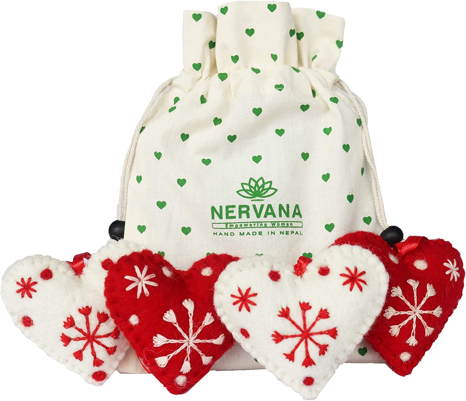 - ✅SPECIFICATIONS: Package includes a set of 4 White and Red Large Hearts Christmas Ornaments with special ribbon loop for hanging. Measures Approx. 3"L x 2.5"W. Comes in a Handmade Organic Cotton Pouch. Traditional hand embroidery allowing you to create beautiful decoration this holiday season.