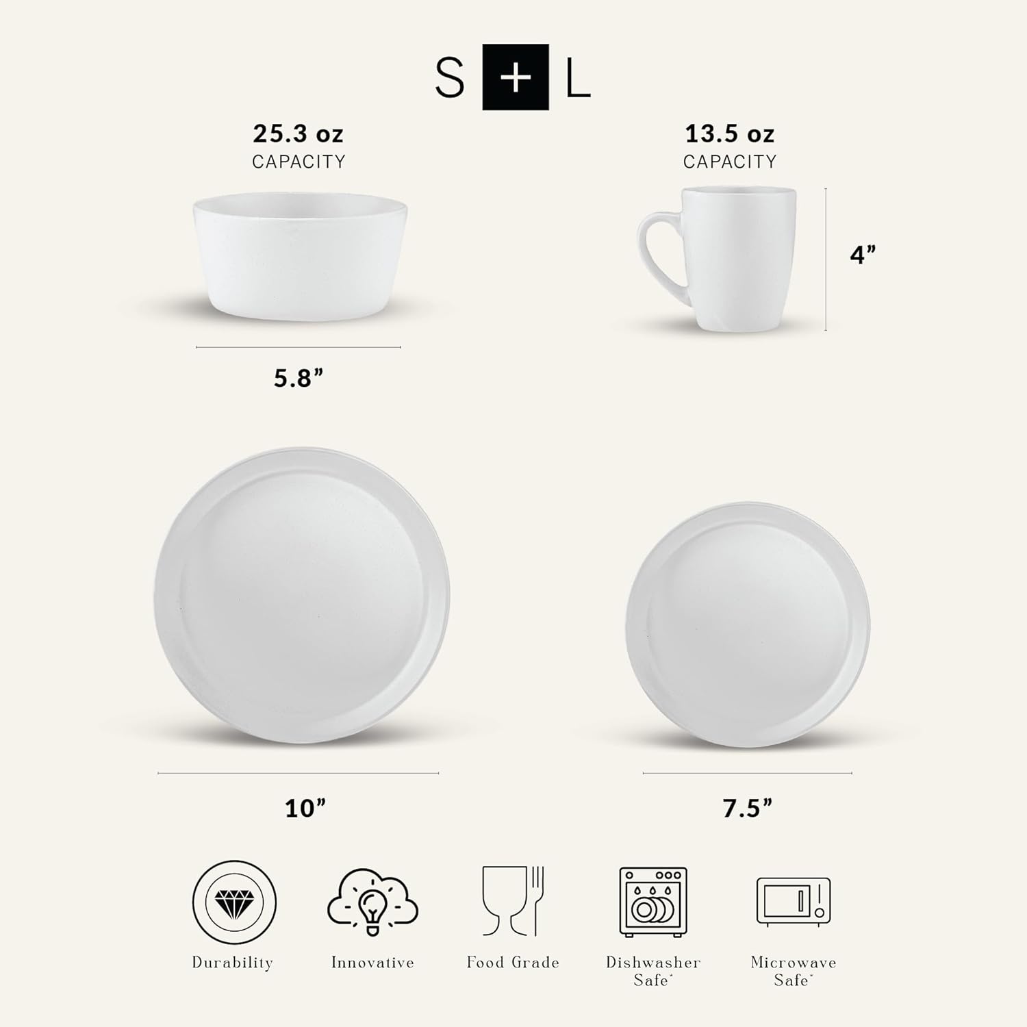 - 32-piece dinnerware service for 8 includes 10" dinner plates, 7.5" salad plates, 5.75" bowls, and 12.5 oz mugs—perfect for family meals or entertaining guests in style.