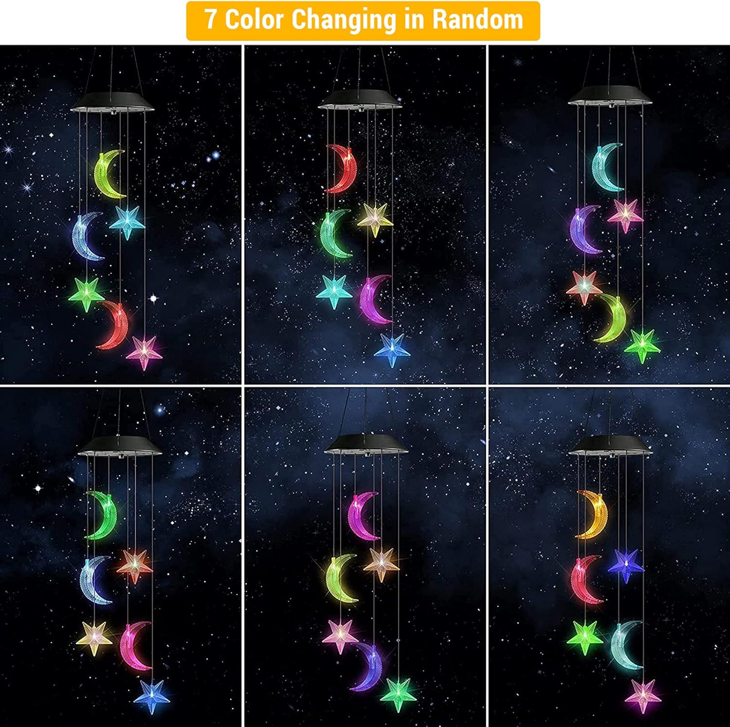 - ⭐【Top Gift Idea】This lovely solar wind chimes will give a surprise to your friends and families. Top gift choice for birthday, mother day, Thanksgiving, Christmas, Memorial day. Color changing LED Moon and Star will make livable, enjoyable atmosphere. If any problems, please feel free to contact us via Amazon e-mail box.