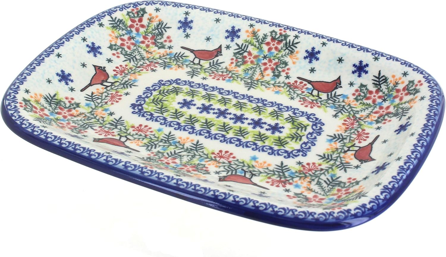 Blue Rose Polish Pottery Winter Cardinal Medium Rectangular Serving Platter