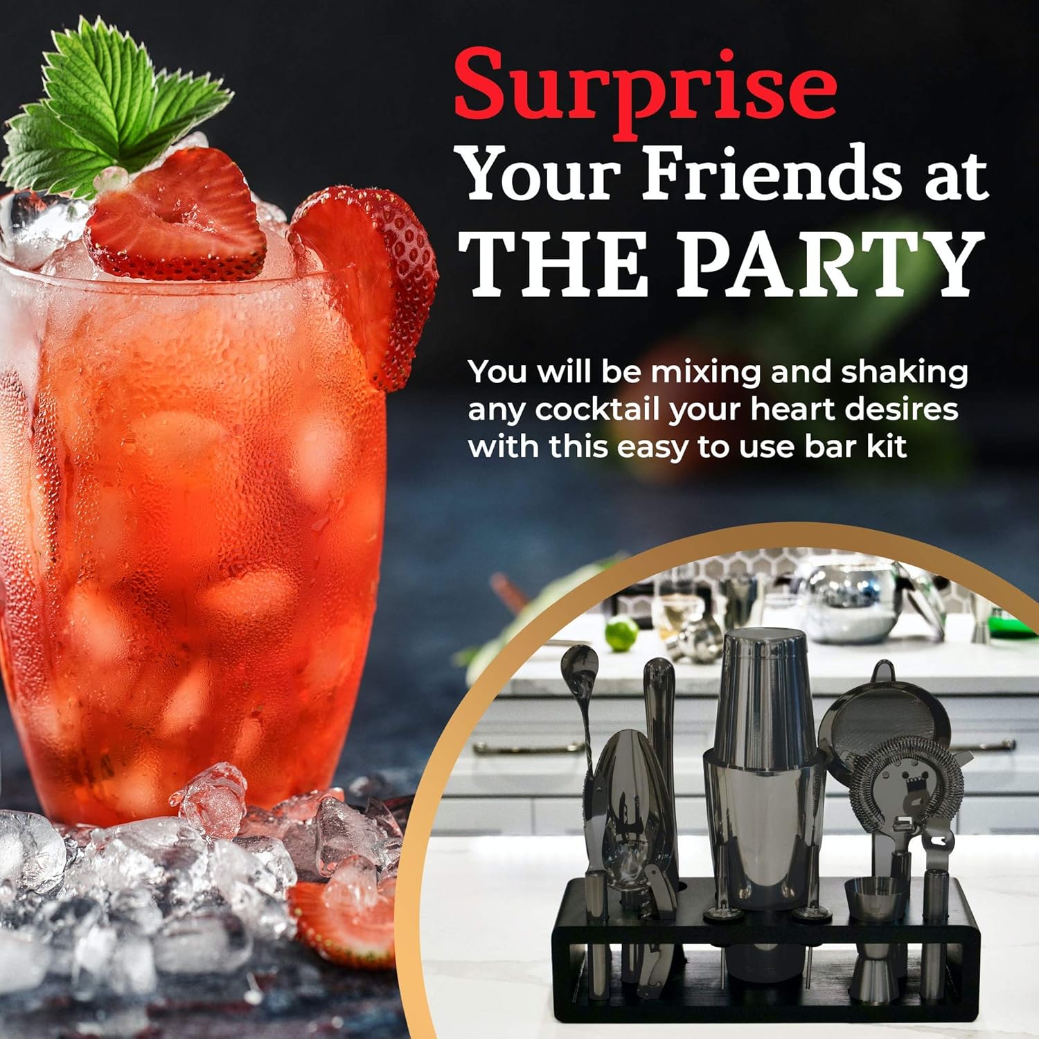 Highball & Chaser 13-Piece Gunmetal Black Stainless Steel Boston Cocktail Shaker Bar Tool Set with Mixology Bartender Kit Accessories