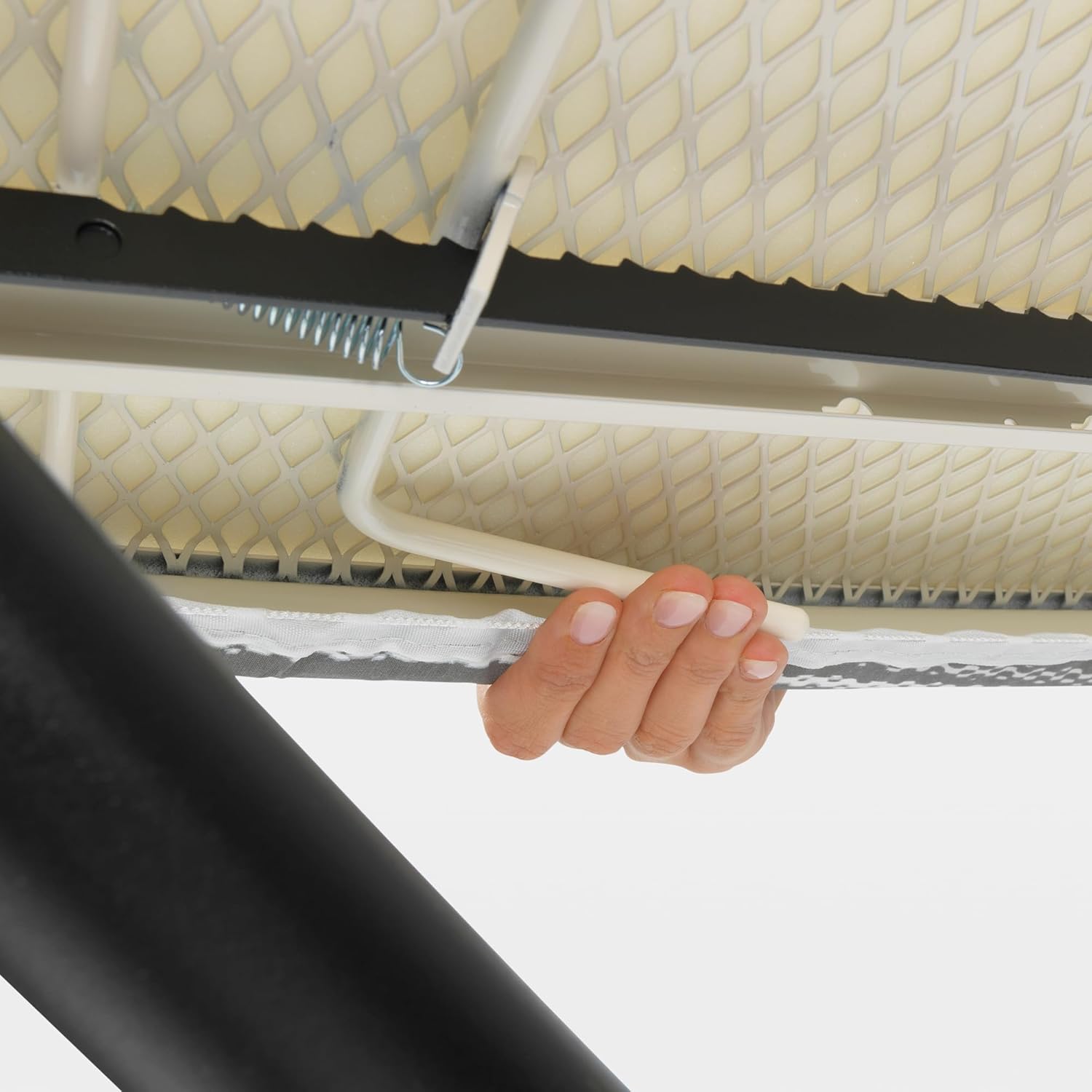 - Relaxed - asymmetric frame is suitable for ironing sitting down. No wobbling - stable and solid four legged frame (1.4" β steel tube) with protective non-slip caps.