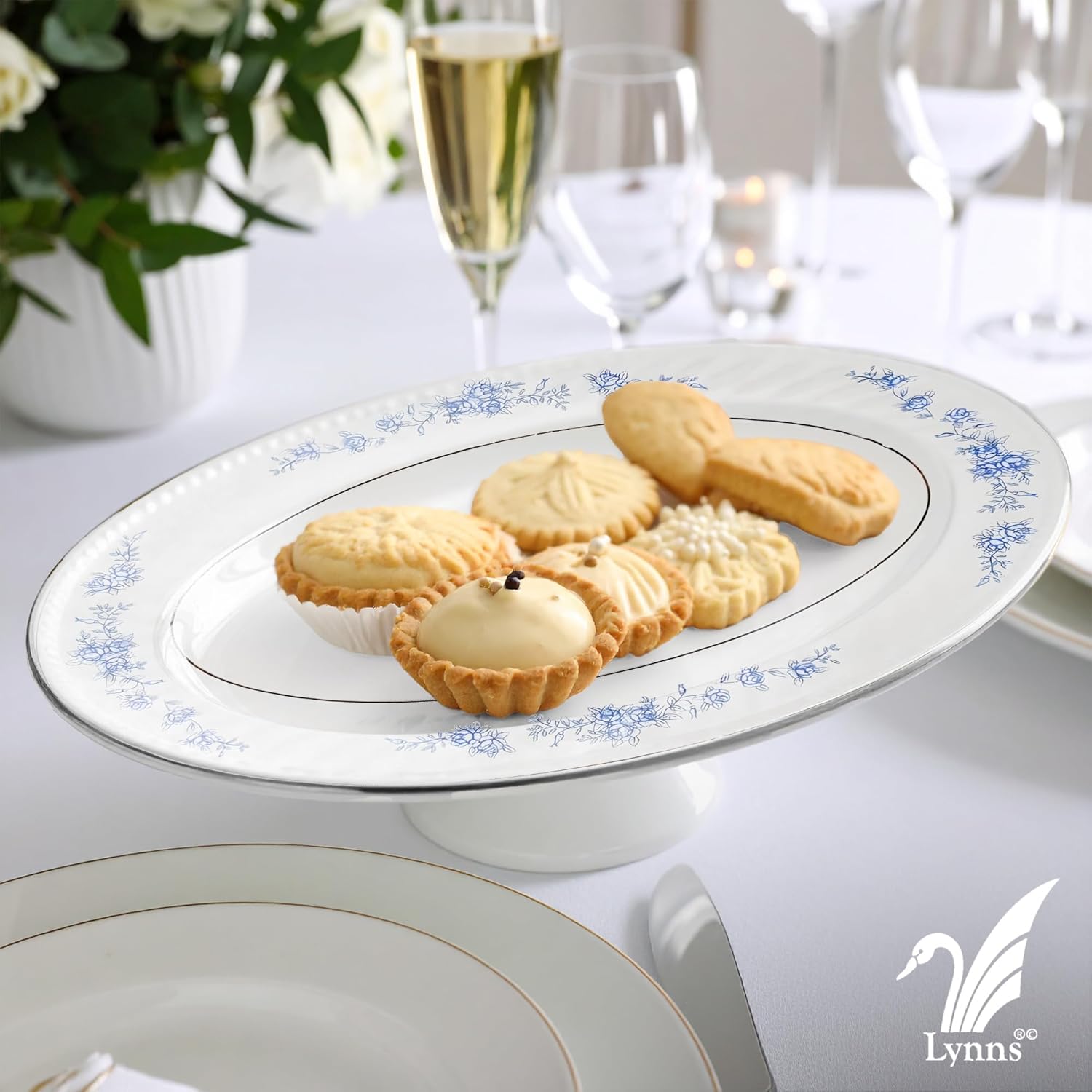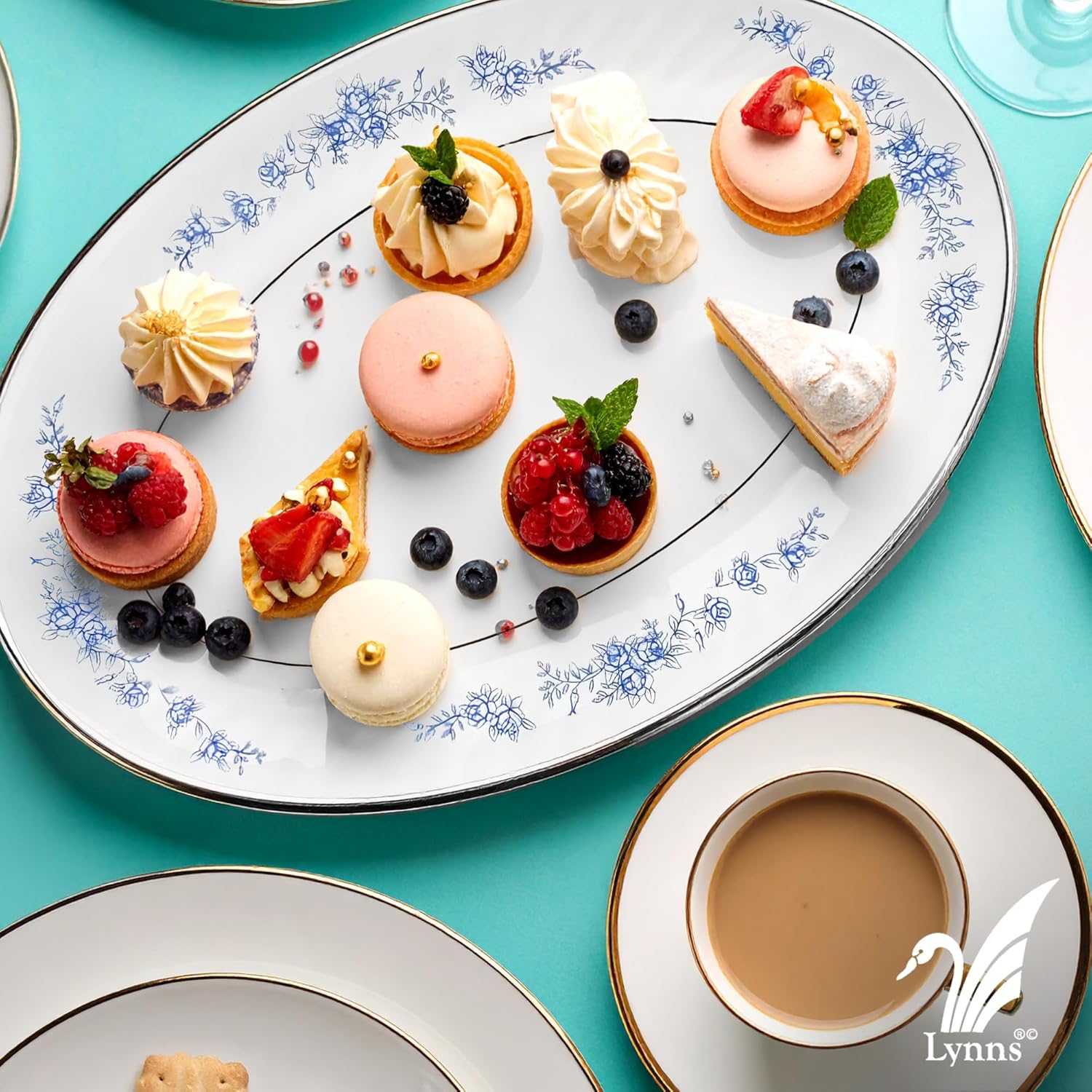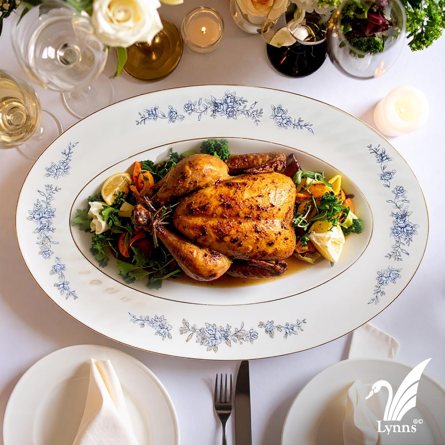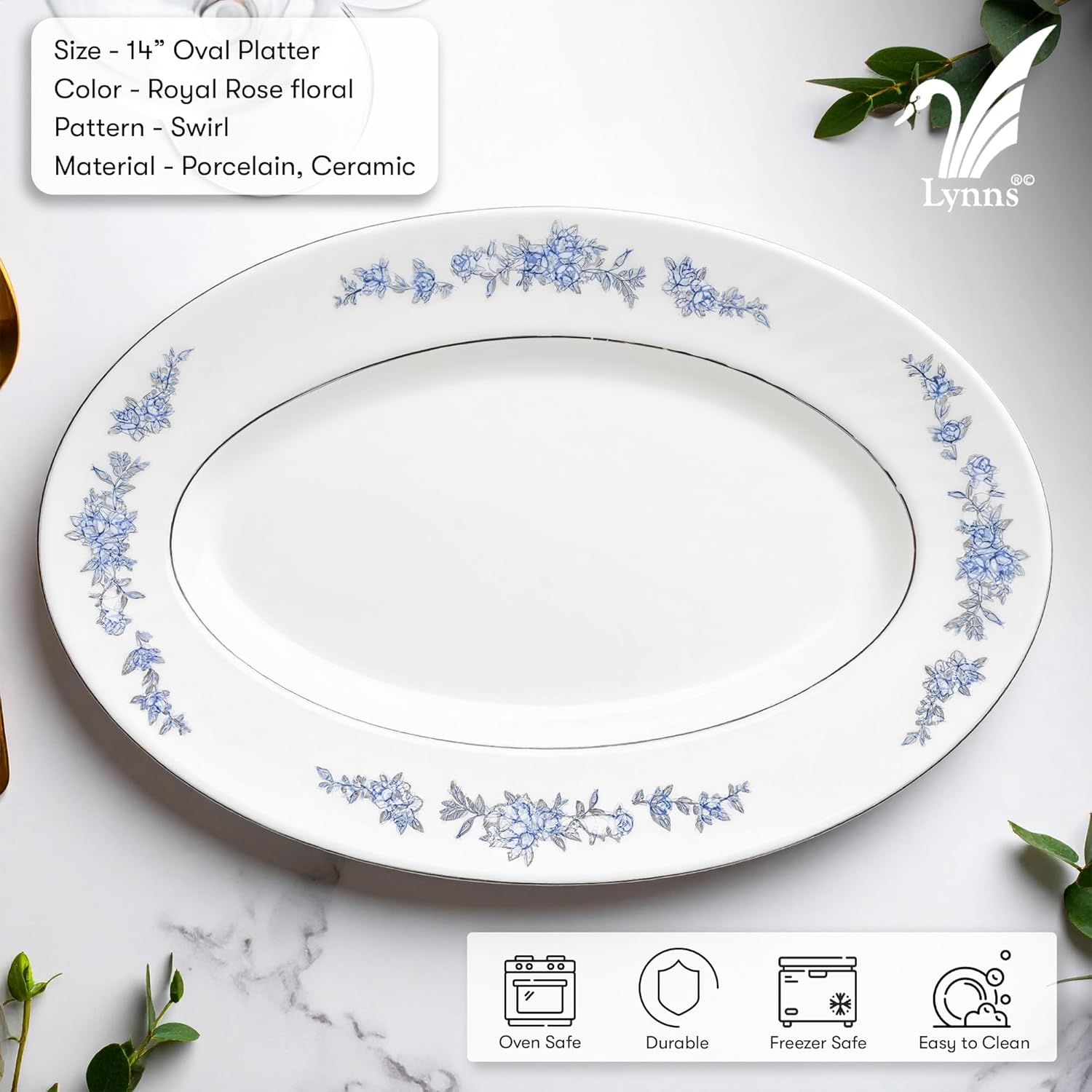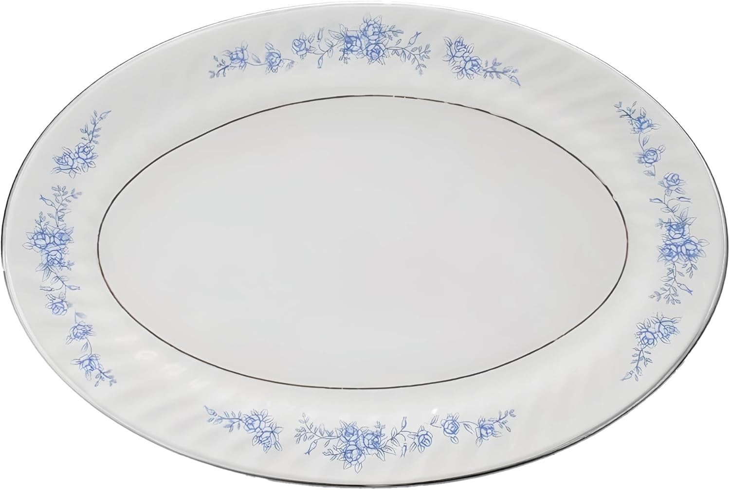 Lynns Paradise Royal Rose 14-Inch Oval Platter, Set of 2, Blue; Heavy Duty; Chip Resistant; Lead and Cadmium Free; Freezer to Oven Safe up to 500°F