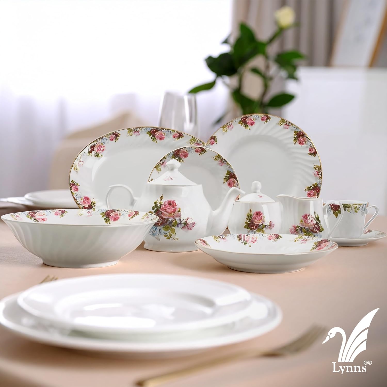- White porcelain body. Each piece is shaped with a rippled swirl shape.
