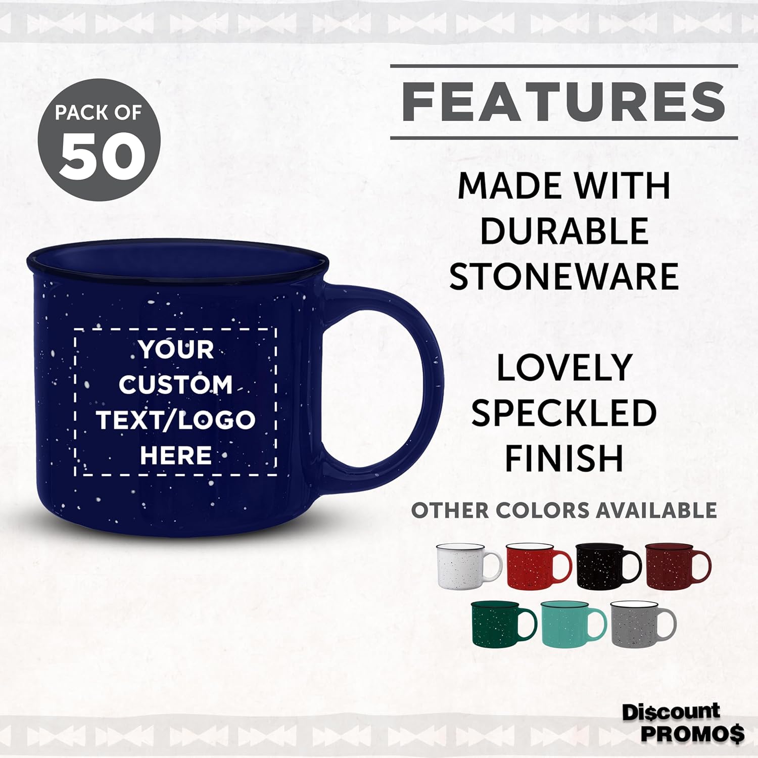 DISCOUNT PROMOS Custom Ceramic Campfire Coffee Mugs 13 oz. Set of 50, Personalized Bulk Pack - Perfect for Tea, Espresso, Cappuccino, Hot Cocoa - Blue