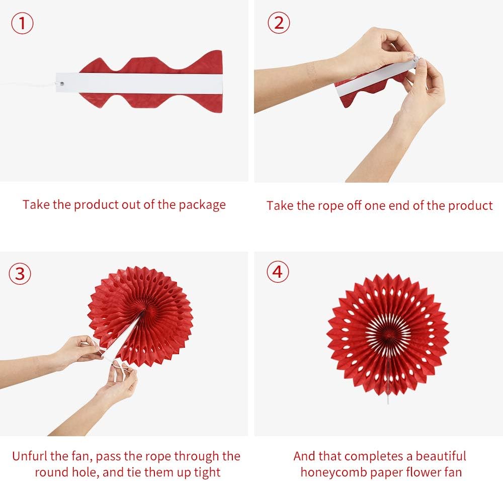 - ★Easy to assemble and uniquely designed ★These hanging paper fans have a hanging string attached,just unfold the paper flower fan and fix it with the rope of the paper flower fan, then you can hang it to your favorite place and decorate your party perfectly in a few minutes.