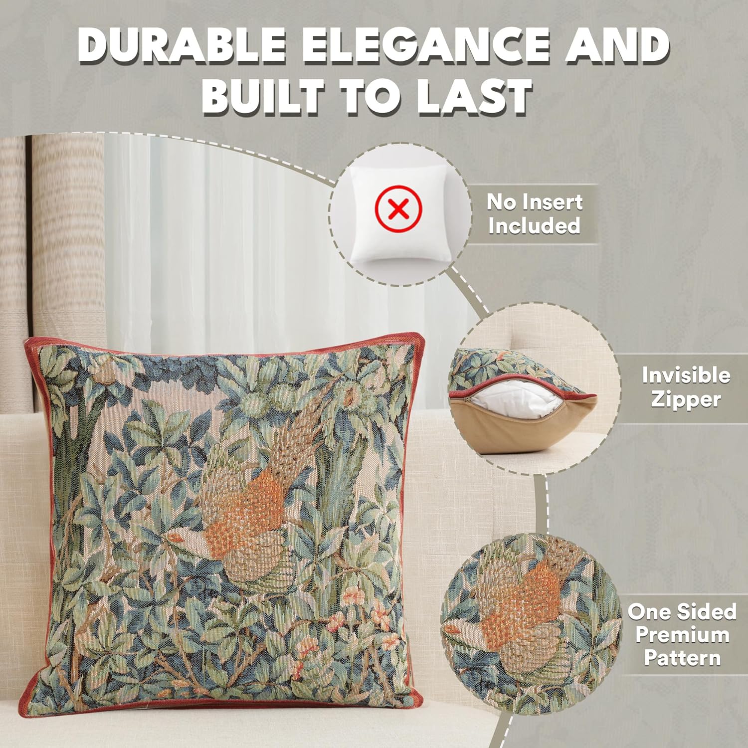 Charlotte Home Furnishings Decorative Tapestry Pillow Cover 19x19 in, Green Pheasant Couch Throw Pillow Cover, French Country Square Cushion Cases for Bed Room Home Decor, Soft Cotton Jacquard Woven