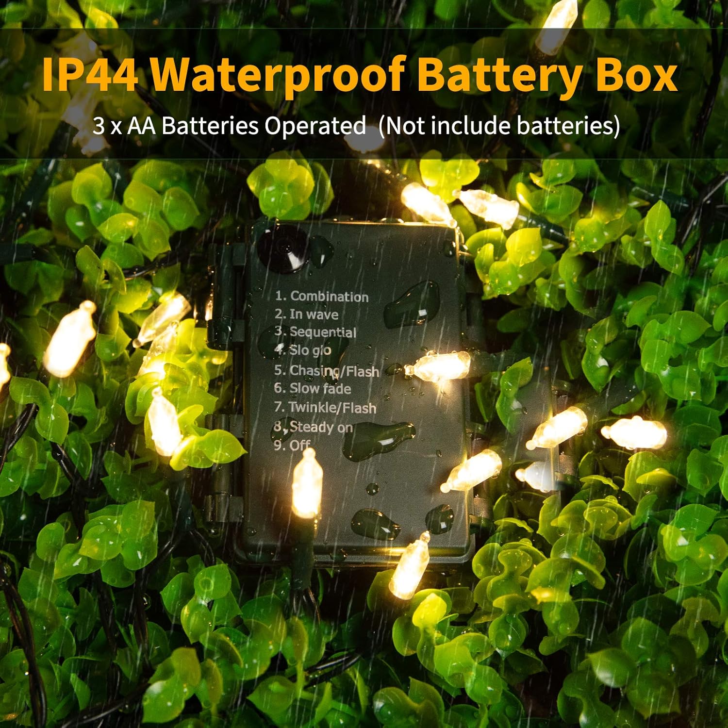 - 【Battery operated】3 AA batteries (Not included) operated, 2 pack 18 feet 50 mini LED strands, 3.94 inch lights spacing with compact water resistant battery control box, energy saving and eco-friendly. Operation time depends on the running time and the quality of installed battery