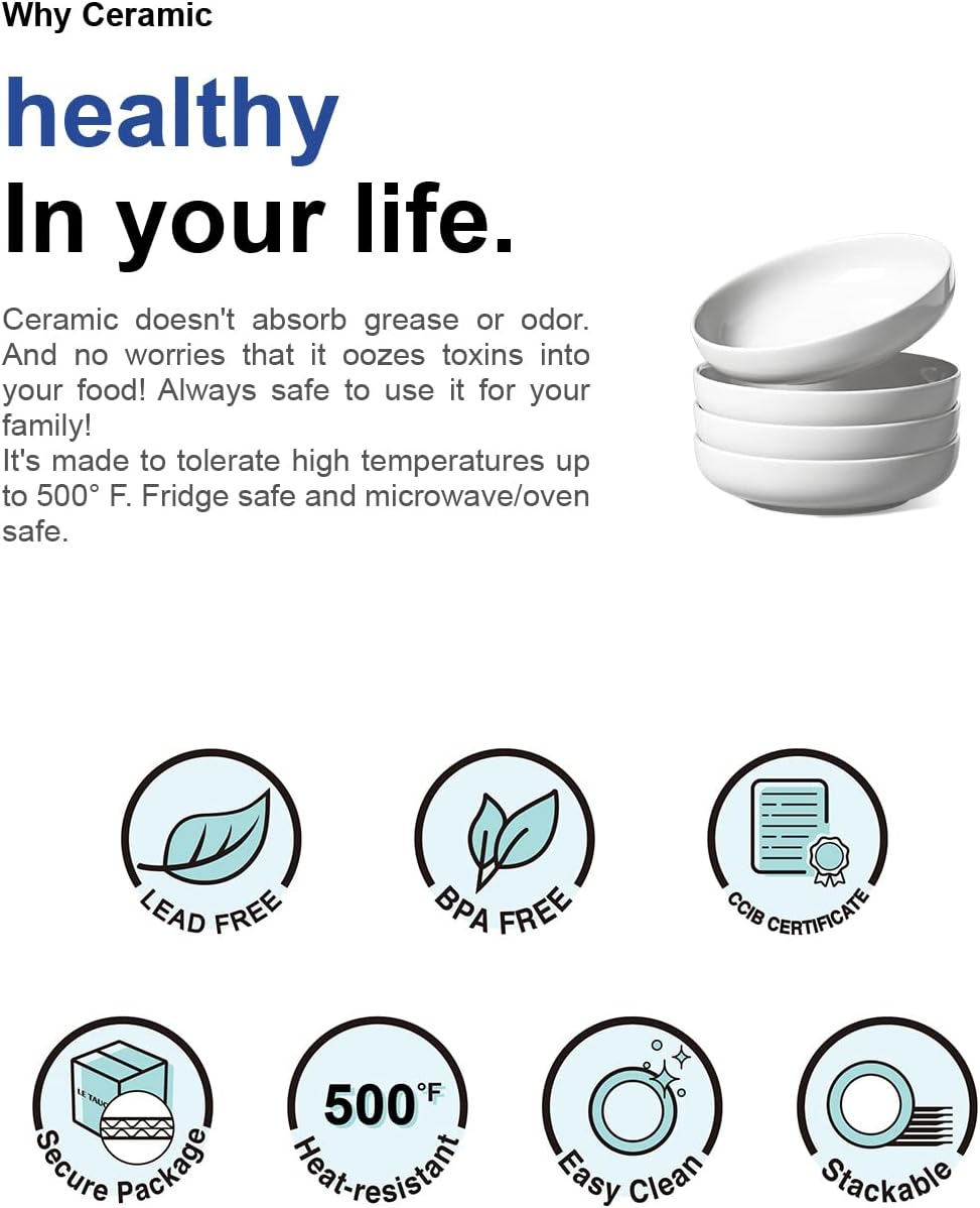 - A Simple And Trendy Shape:These LE TAUCI 32 ounce shallow bowls are suitable for pasta, soup, dessert, ice cream, rice, beans and so on. You would find you could use them for much more than pasta. They are also great for any meal that has a sauce that might escape off of a regular plate