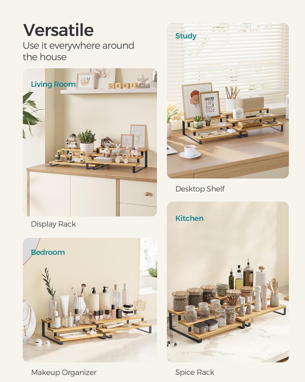 - 【VERSATILE】This 3-tier spice shelf is perfect for home use or store displays. Use it on countertops, dining tables, vanities, or in cabinets for showcasing condiments, desserts, perfumes, cosmetics, or collectibles