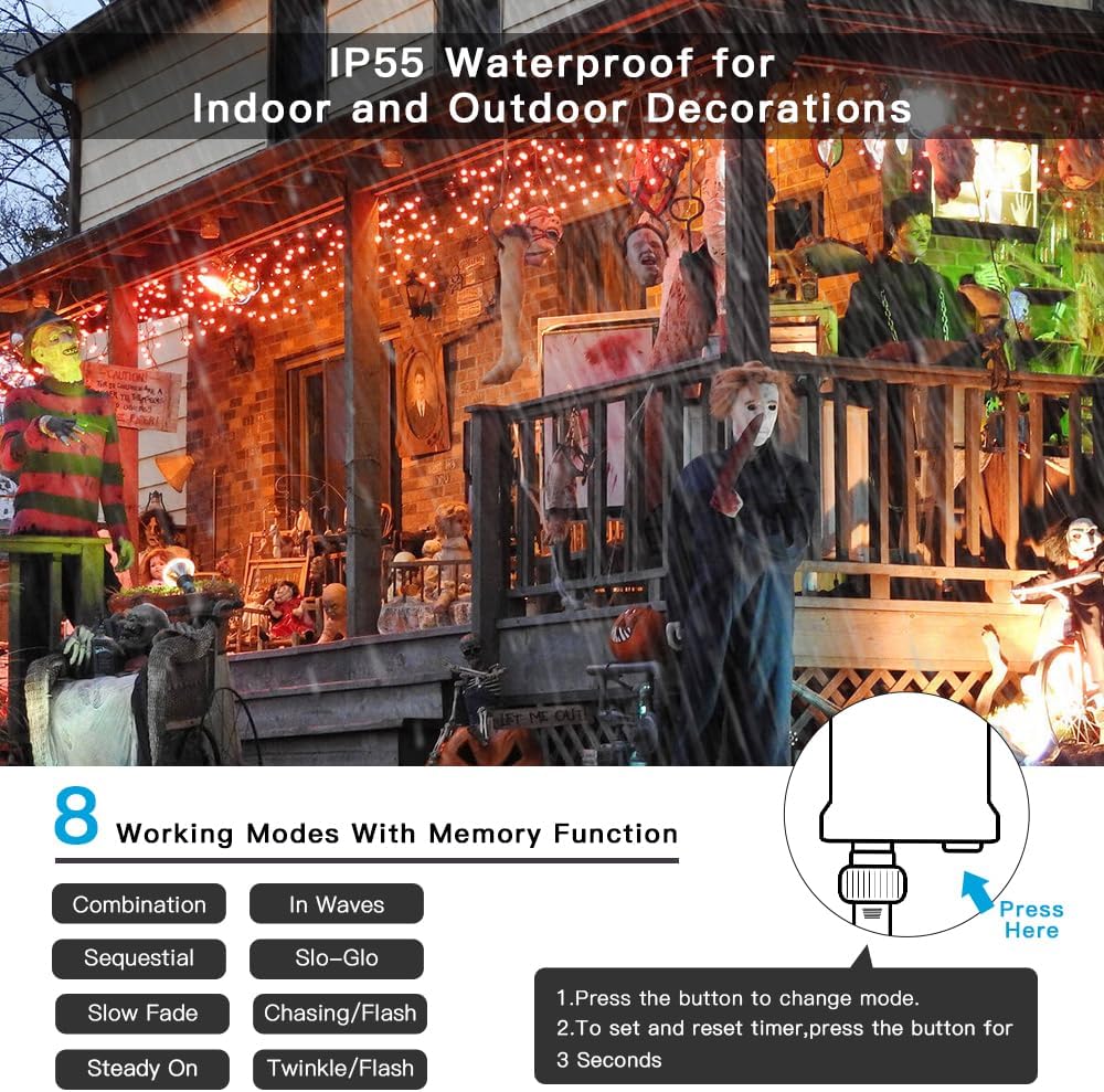 - 8 Modes + Remember Functional: These Christmas lights include 8 modes: combination, in waves, sequential, slo-glo, chasing/flash, slow fade, twinkle/flash, steady on. The controller is designed to remember the last setting after cutting off the power. No need to set the light again