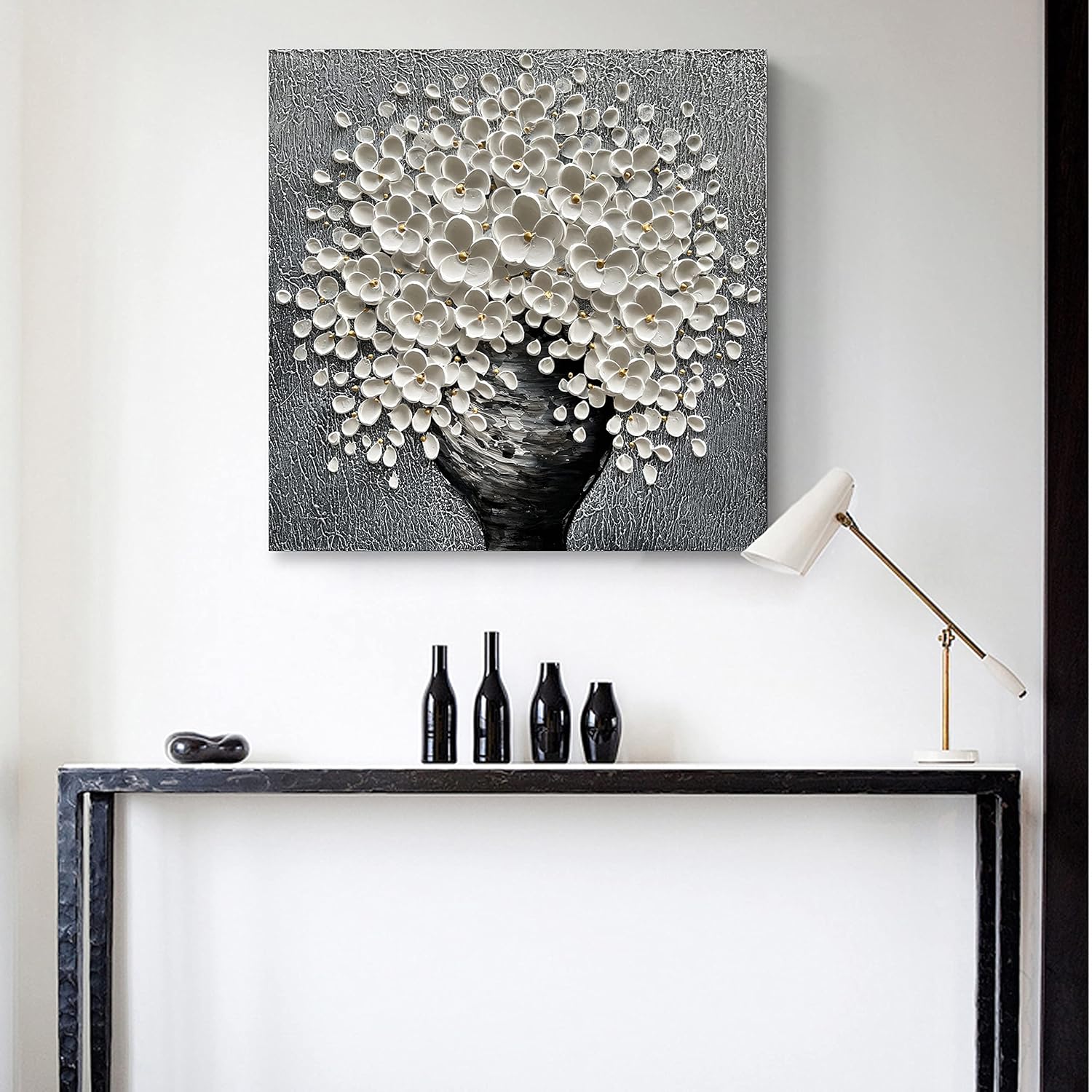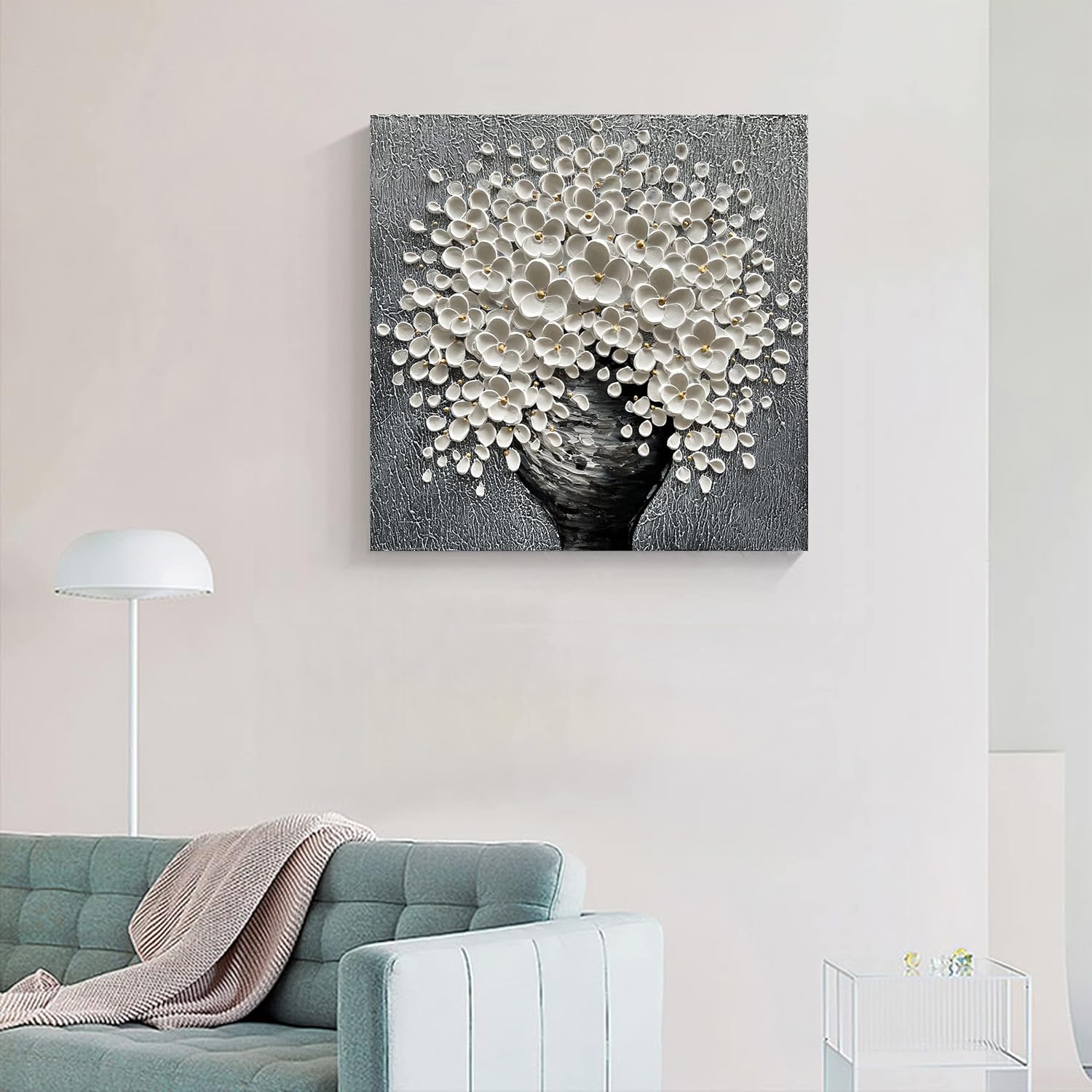White Flower Oil Painting Modern Abstract Art Oil Painting Home Bedroom, Dining Room, Living Room, Office Wall Decoration (20x20 inches)
