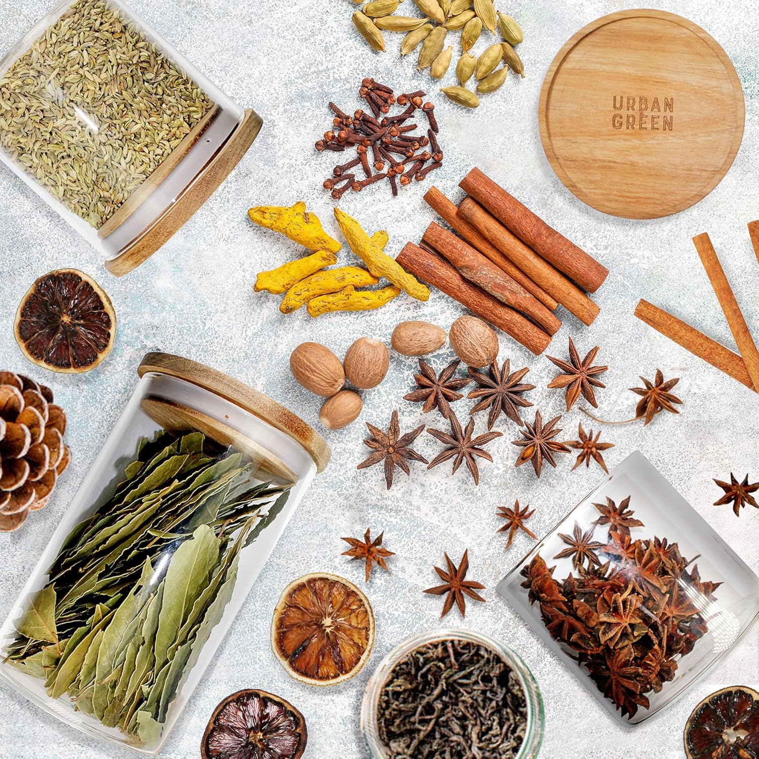 - β PREMIUM BOROSILICATE GLASS & WOOD LID: Urban Green glass canisters are made of high-quality borosilicate glass with smooth and beautifully fine polished Wood Lids in set of 6 Pack. Our Wood lids are made of Acacia Wood, they are strong, durable, and classic looking. The non-reactive clear glass resists stains, food adores, it is nonporous, worry free of germs, or even smells seeping into your glass containers. Make heathy products a part of your everyday life!