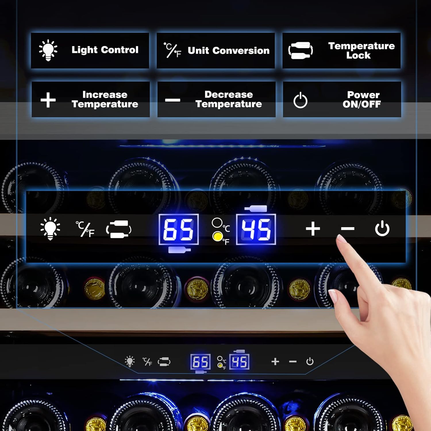 - ăAdvanced Compressor & Low NoisăThis dual zone wine cooler use an advanced compressor that effectively provides Fast, Strong, Stable cooling and accurate Humidity, with a unique vibration absorption system and adjustable and stable 4 cabinet feet with that Noise can be controlled under 38 dB which provides a quiet environment for your house.