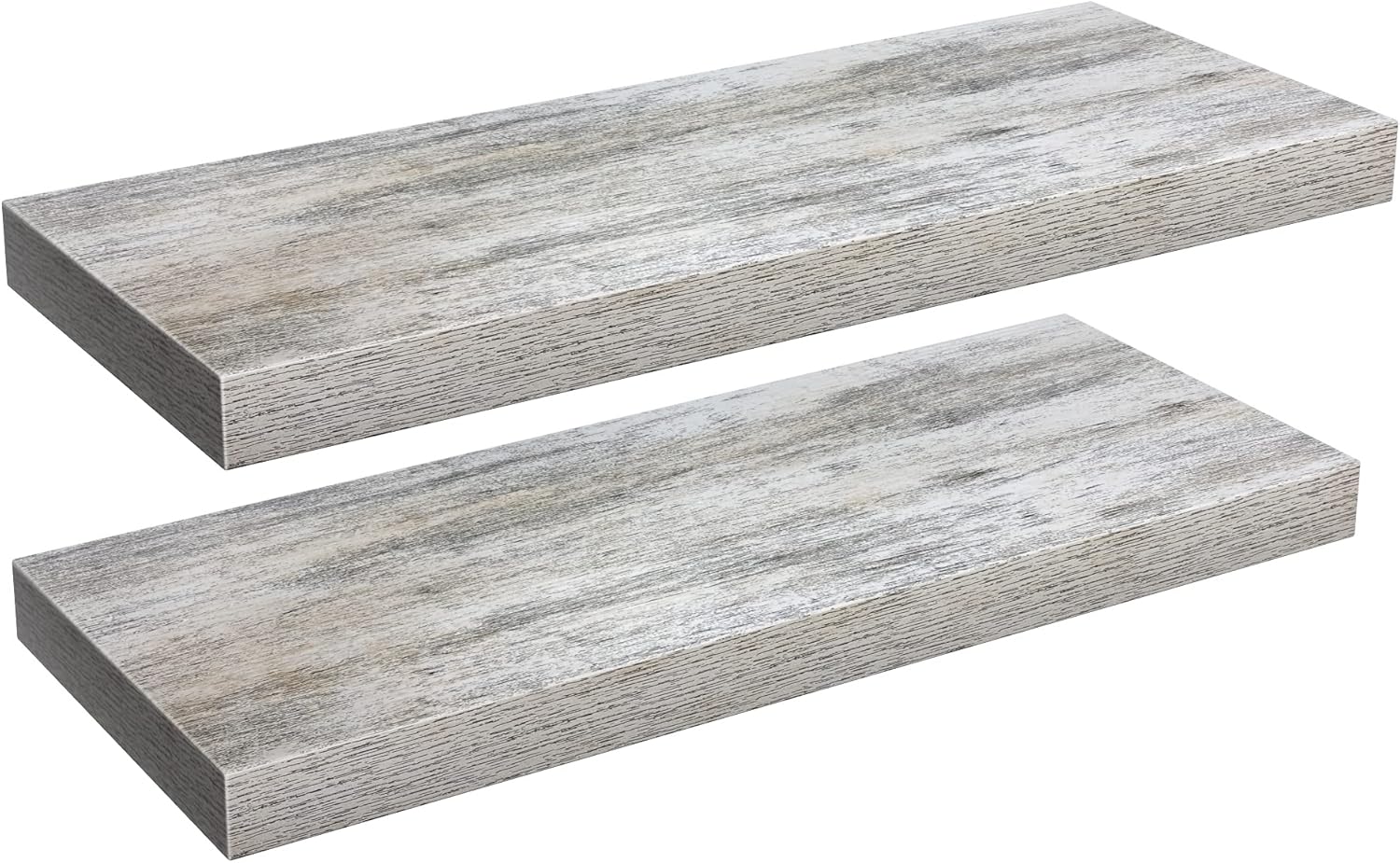- Rustic White Floating Shelves for Wall Storage: 2 Pack 24 X 9 Inch Floating Shelves - Display charming showpieces for beach decor, coastal decor or home decor items, and other prized possessions while offering functional wall bookshelf, book shelf or bathroom shelf storage. Our beach bathroom decor shelf Measures approximately 24" L X 9" W 1.50" thick - The shelf colors might be a bit different from the pictures due to the different lighting and screen settings