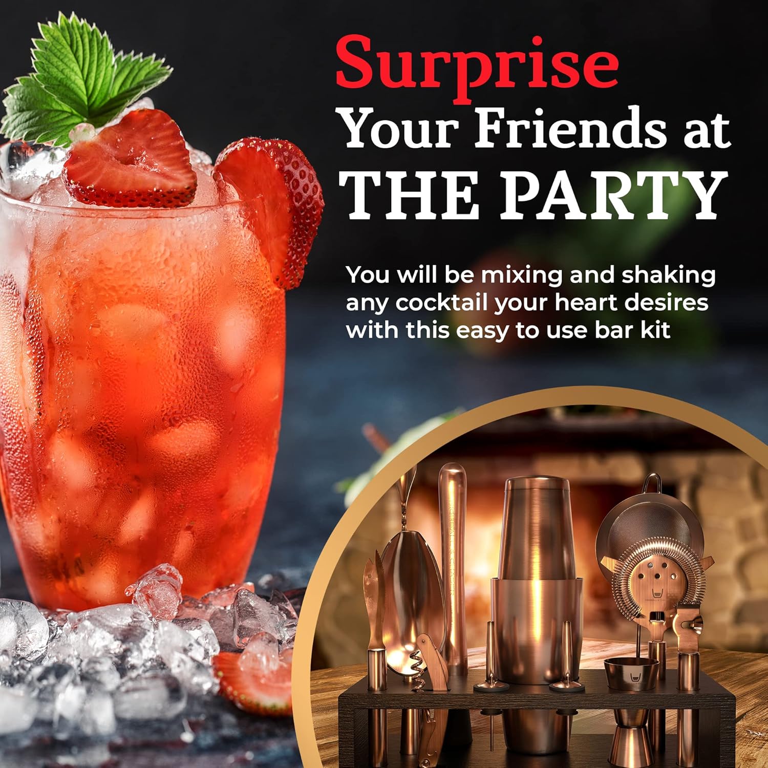 Highball & Chaser Bartender Kit with Black Bamboo Stand Beautiful Cocktail Shaker Set and Bar Tools Stainless Steel Boston Shaker Bartender Kit with Stand (Antique Copper)