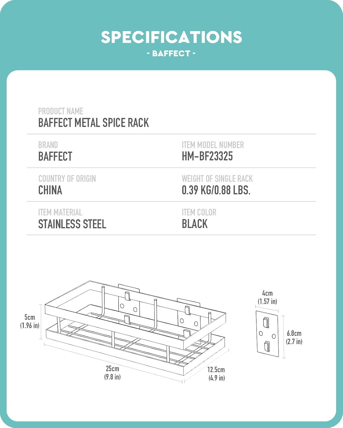 - [SPECIFICATION] There are 2 shelves in the package. Dimension of each spice rack is 9.8(L) x 4.9(W) x 2.7(H) inches, the net weight is 0.88lbs.