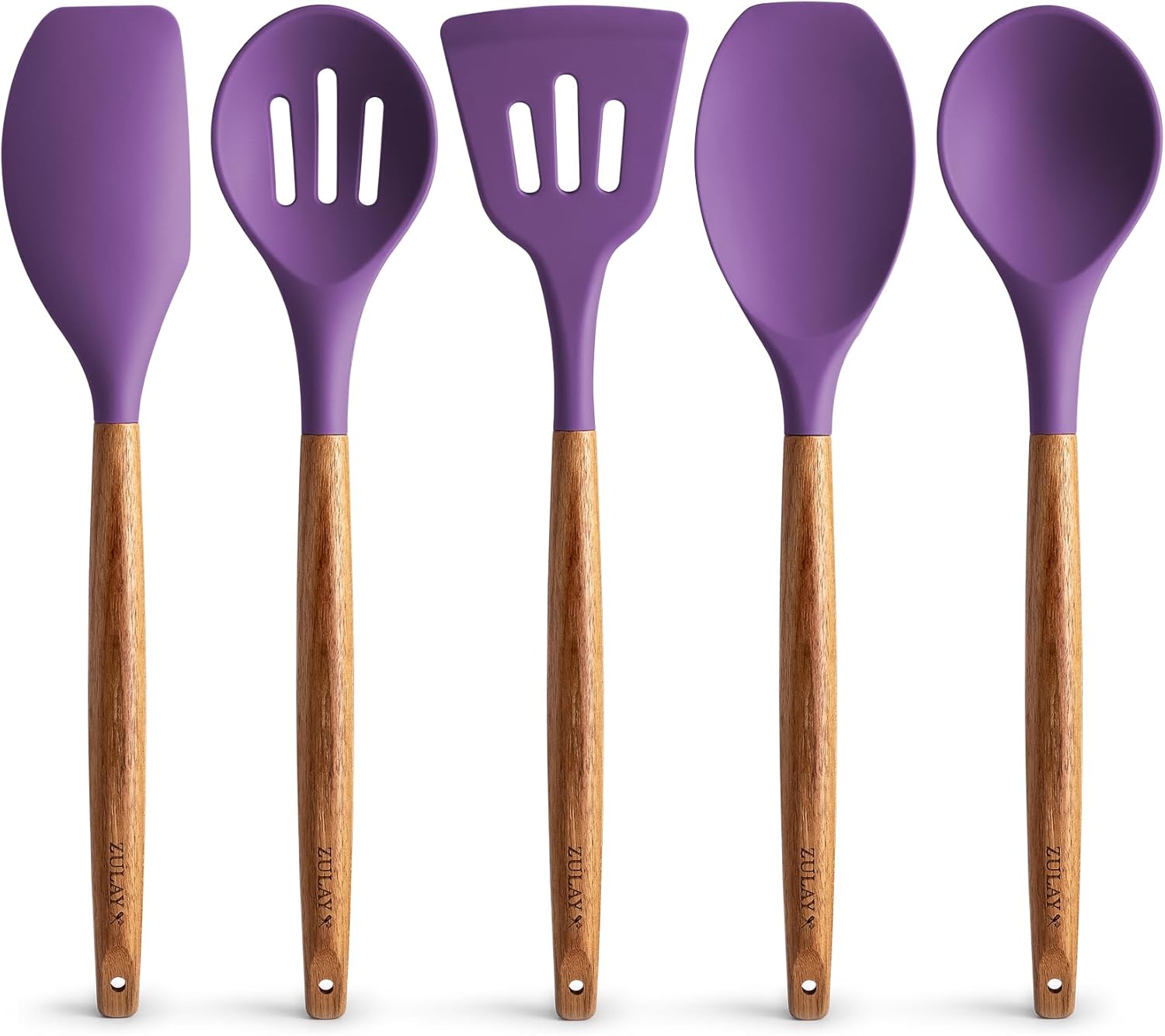 Zulay Kitchen Non-Stick Cooking Utensils Set with Authentic Acacia Wood Handles – 5-Piece Durable & Stylish Silicone Kitchen Utensils Set – Heat Resistant to 464°F – Purple