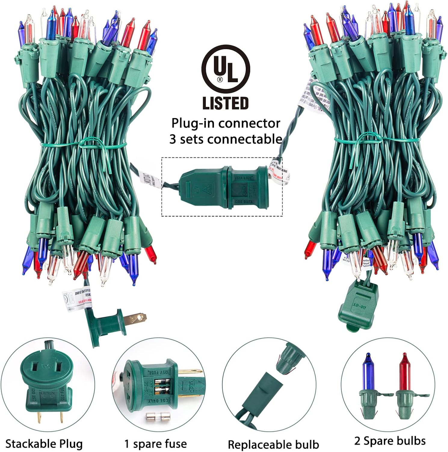 - Creative Patriotic Decorations: This Independence Day Decorations light on green wire set includes 200 incandescent mini bulbs. The total length is 51.7 feet, each bulb is 3 inches apart, 20 inches lead wire, 3 inches end connector. It can be connected end to end to meet your decoration needs, up to 3 creative light strings