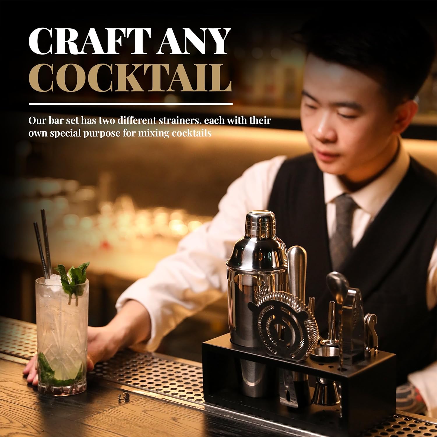 - MIX DRINKS LIKE A PRO: This cocktail kit makes professional-level mixology incredibly easy. Instantly transform your home bar with a sleek, modern looking array of bar accessories, all displayed beautifully in a dark wood stand. Forget about finding a new recipe online every time or getting wrong measurements, with the included 16 recipe cocktail book, you’ll have everything you need to start mixing drinks at home.