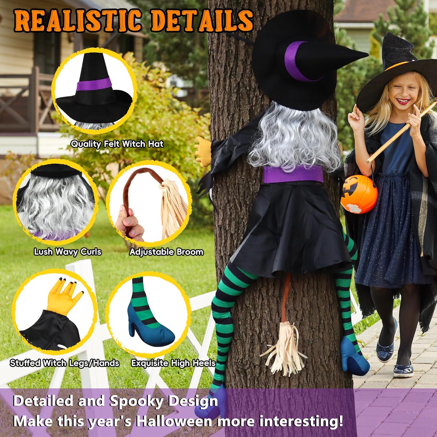 POPGIFTU 63" Crashing Witch Halloween Decoration – Flying Witch on Broom Into Tree Outdoor Yard Prop for Porch, Lawn, Garden, Pillars, Door, or Haunted House Decor