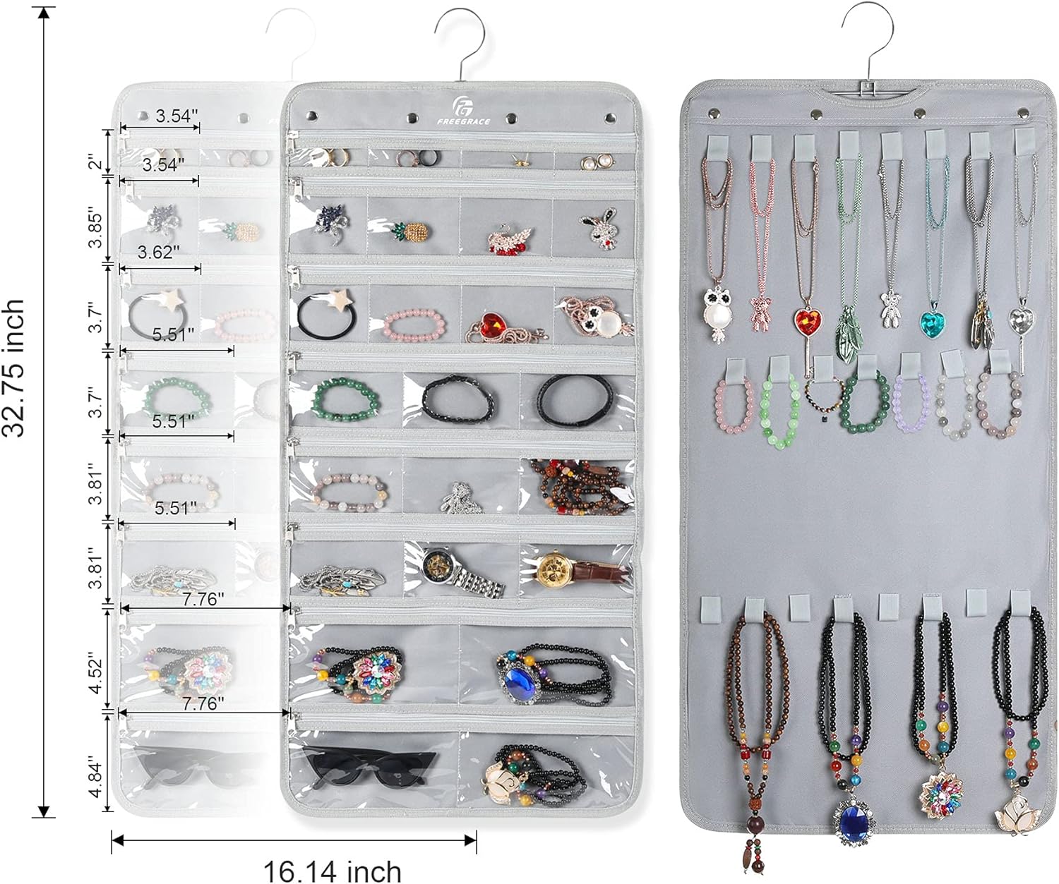 - QUALITY MATERIALS: Freegraceโs sturdy hanging jewelry organizer is made of 600D polyester Oxford fabric and has a PU backing (SIZE: 32.7โโ x 16.5โโ). The pockets are made of transparent PVC to allow you to see through to the stored jewelry, and the zipper and revolving metal hanger are well-made and durable.