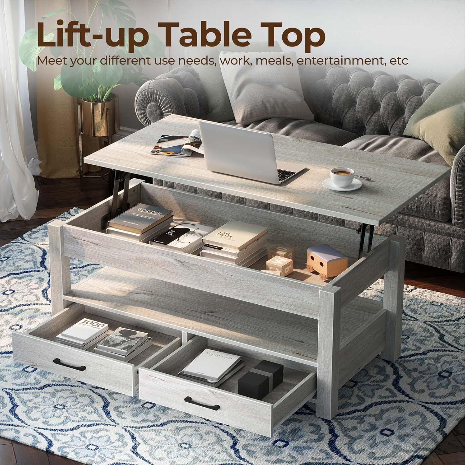 Rolanstar Coffee Table, Lift Top Coffee Table with Drawers and Hidden Compartment, Living Room Table with Wooden Lift Tabletop, for Living Room, Grey
