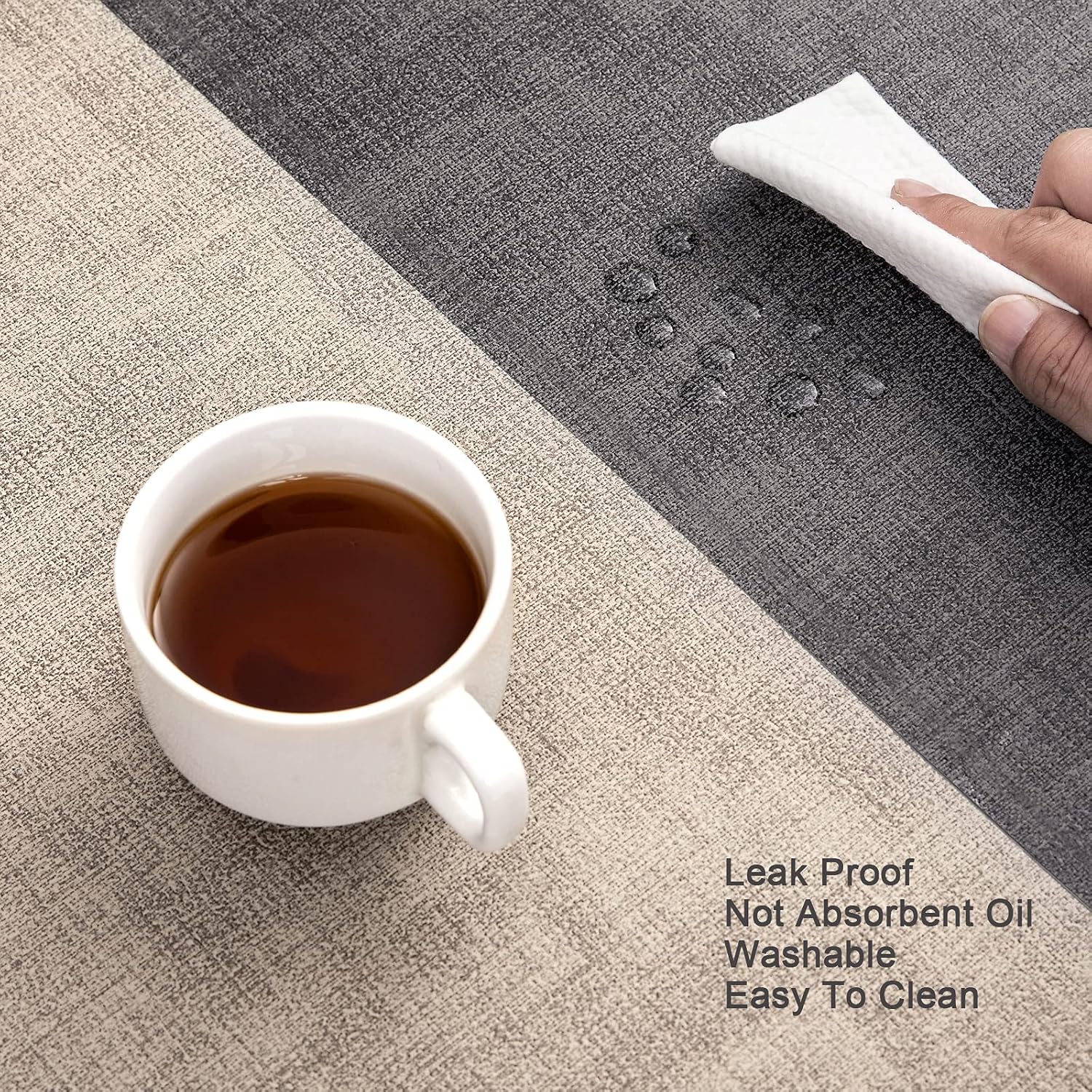 - These placemats are made of faux leather, the sufface texture imitate the linen. Unlike woven or fabric placemats, these placemats are water resistant, they can block the sauce or any liquids to protect the desktop.