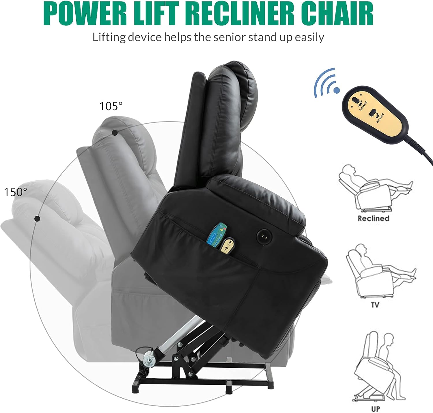 - ăPower Lift Reclineră - The TUV certified motor equipped recliner can lift you up when you want to get up from chair, by pressing a button on the remote control, it lifts or reclines smoothly and quietly, help the elderly stand up easily without adding stress to back or knees. And it features reclining to different angles by electric control, you can lie down in a cozy position and take a rest, or TV watching, let you relax from the busy day