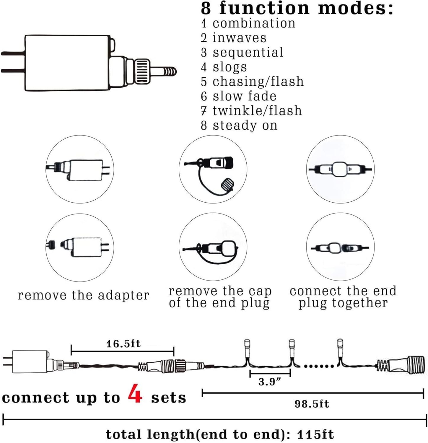 - Charming Xmas Lights: Christmas 300 LED string lights, use UL-certified 29V low-voltage plugs to ensure the safe use of the product. The outdoor Christmas lights has 16.5 FT leading wire, and the light string is 98.5 FT, total length is 115 FT, the bulb spacing is 3.9 inch. The string light using green wire, which looks more natural and suitable for winter using.