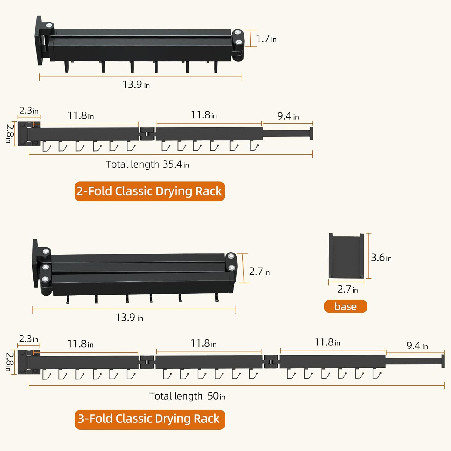 - β Upgraded Foldable Clothes Drying Rack Design -- Our clothes drying rack wall mounted features a tri-fold design with a total length of 47.2 inches and a compact folding length of just 14 inches, making it an ideal space saver for your laundry room or apartment **Warm Tips: sheetrock wall is not recommended