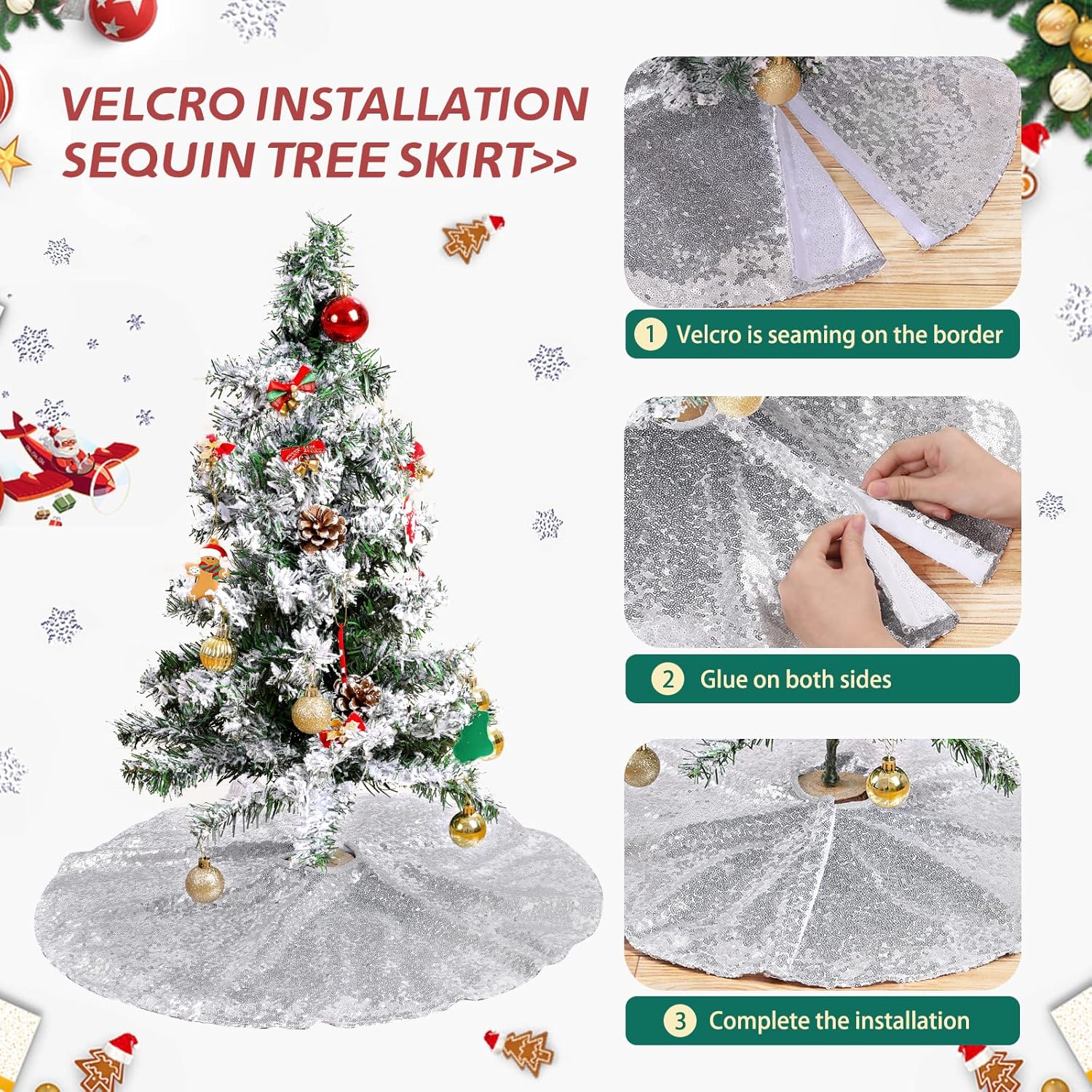 - Easy Installation: Our glitter tree skirt can be installed in seconds, and you can use them to attach a Christmas tree skirt to the base of an artificial or real Christmas tree.